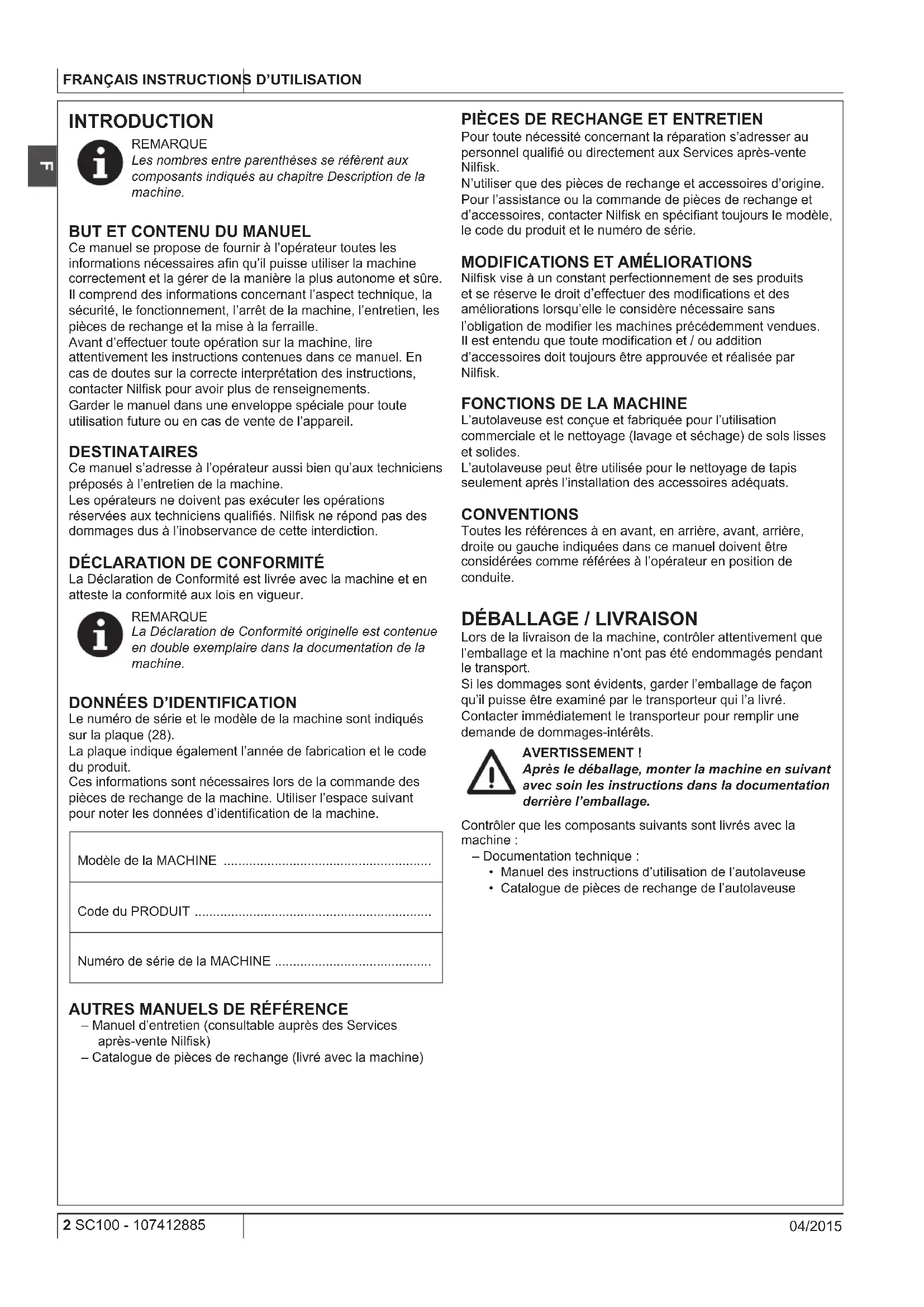 - Catalogue de pièces de rechange de l’autolaveuse 107412885(1)04-2015 A.indb 2 16/09/2015 16:54:37INSTRUCTIONS D’UTILISATION FRANÇAIS 107412885 - SC100 3 04/2015 SÉCURITÉ On utilise les symboles suivants pour signaler les conditions de danger potentielles. Lire attentivement ces informations et prendre les précautions nécessaires pour protéger les personnes et les choses. Pour éviter tout accident la collaboration de l’opérateur est essentielle. Aucun programme de prévention des accidents du travail ne peut résulter efcace sans la totale collaboration de la personne directement responsable du fonctionnement de la machine. La plupart des accidents sont dus à l’inobservance des plus simples règles de prudence.