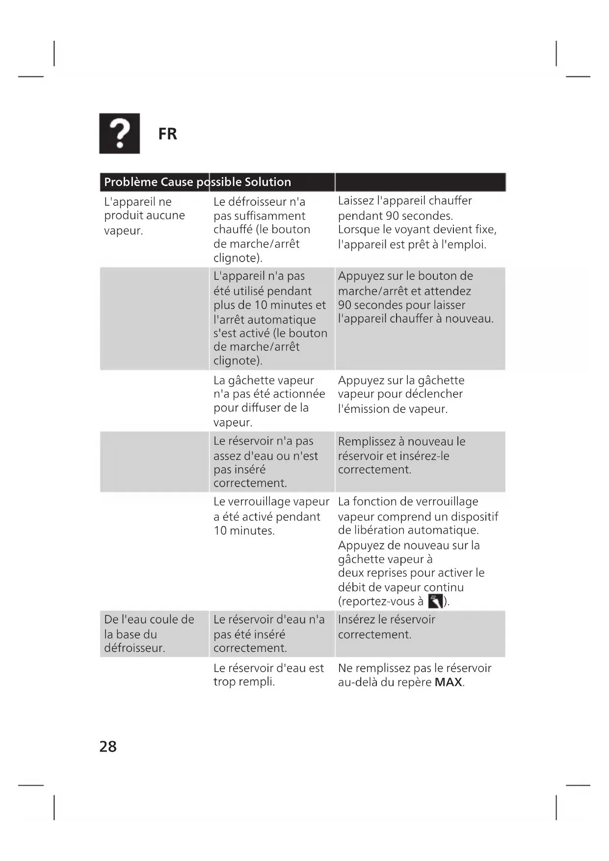 De l'eau coule de la base du défroisseur. Le réservoir d'eau n'a pas été inséré correctement. Insérez le réservoir correctement. Le réservoir d'eau est trop rempli. Ne remplissez pas le réservoir au-delà du repère MAX. FR29 Problème Cause possible Solution Le verrouillage vapeur ne peut pas être activé. Il est impossible d'activer la fonction de verrouillage vapeur. Appuyez deuxfois pour activer la fonction de verrouillage vapeur (reportez- vous à