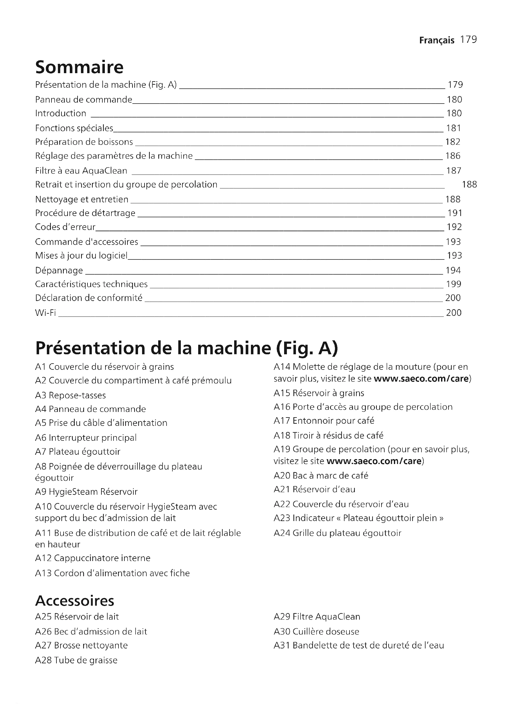 Français Sommaire Présentation de la machine (Fig. A) __________________________________________________________ 179 Panneau de commande____________________________________________________________________ 180 Introduction _____________________________________________________________________________ 180 Fonctions spéciales________________________________________________________________________ 181 Préparation de boissons ___________________________________________________________________ 182 Réglage des paramètres de la machine ______________________________________________________ 186 Filtre à eau AquaClean ____________________________________________________________________ 187 Retrait et insertion du groupe de percolation _________________________________________________ 188 Nettoyage et entretien ____________________________________________________________________ 188 Procédure de détartrage ___________________________________________________________________ 191 Codes d’erreur____________________________________________________________________________ 192 Commande d'accessoires __________________________________________________________________ 193 Mises à jour du logiciel_____________________________________________________________________ 193 Dépannage ______________________________________________________________________________ 194 Caractéristiques techniques ________________________________________________________________ 199 Déclaration de conformité _________________________________________________________________ 200 Wi-Fi ____________________________________________________________________________________ 200 Présentation de la machine (Fig. A) A1 Couvercle du réservoir à grains A2 Couvercle du compartiment à café prémoulu A3 Repose-tasses A4 Panneau de commande A5 Prise du câble d’alimentation A6 Interrupteur principal A7 Plateau égouttoir A8 Poignée de déverrouillage du plateau égouttoir A9 HygieSteam Réservoir A10 Couvercle du réservoir HygieSteam avec support du bec d’admission de lait A11 Buse de distribution de café et de lait réglable en hauteur A12 Cappuccinatore interne A13 Cordon d’alimentation avec fiche A14 Molette de réglage de la mouture (pour en savoir plus, visitez le site www.saeco.com/care) A15 Réservoir à grains A16 Porte d’accès au groupe de percolation A17 Entonnoir pour café A18 Tiroir à résidus de café A19 Groupe de percolation (pour en savoir plus, visitez le site www.saeco.com/care) A20 Bac à marc de café A21 Réservoir d’eau A22 Couvercle du réservoir d’eau A23 Indicateur «Plateau égouttoir plein» A24 Grille du plateau égouttoir Accessoires A25 Réservoir de lait A26 Bec d’admission de lait A27 Brosse nettoyante A28 Tube de graisse A29 Filtre AquaClean A30 Cuillère doseuse A31 Bandelette de test de dureté de l’eau180 Français Panneau de commande Cette machine à espresso existe en deux versions. Leur panneau de commande est différent, mais toutes les icônes fonctionnent de la même façon. Veuillez vous reporter aux figuresB et C pour un aperçu de toutes les icônes. Leur description figure au-dessous. B1 Off icon (Icône arrêt) C1 On/off icon (Icône marche/arrêt) B2/C2 Drinks (Boissons) B3/C3 Drinks menu (Menu des boissons) B4/C4 Personal profiles (Profils personnels) B5/C5 Grains B6/C6 Machine settings (Paramètres de la machine) B7/C7 Status menu (Statut) B8/C8 Boutique B9/C9 Start/stop icon (Icône démarrage/arrêt) Introduction Félicitations pour votre achat d’une machine à café Saeco entièrement automatique! Pour profiter pleinement des avantages de l’assistance en ligne de Saeco, vous pouvez utiliser le panneau de commande pour enregistrer votre machine via la connexion Wi-Fi intégrée, ou vous rendre sur le site www.saeco.com/MyCoffeeMachine et y enregistrer votre produit. Lisez attentivement le livret de sécurité distinct avant d’utiliser la machine pour la première fois, et conservez-le pour un usage ultérieur. Votre machine à café Saeco entièrement automatique vous permet de vous connecter à votre réseau Wi-Fi pour une expérience optimale. En connectant votre machine à votre réseau Wi-Fi, vous pourrez: