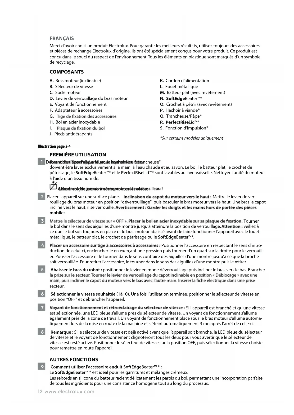 J. Pieds antidérapants K. Cordon d’alimentation L. Fouet métallique M. Batteur plat (avec revêtement) N. SoftEdgeBeater™* O. Crochet à pétrir (avec revêtement) P. Hachoir à viande* Q. Trancheuse/Râpe* R. PerfectRiseLid™* S. Fonction d’impulsion* *Sur certains modèles uniquement Illustration page 2-4