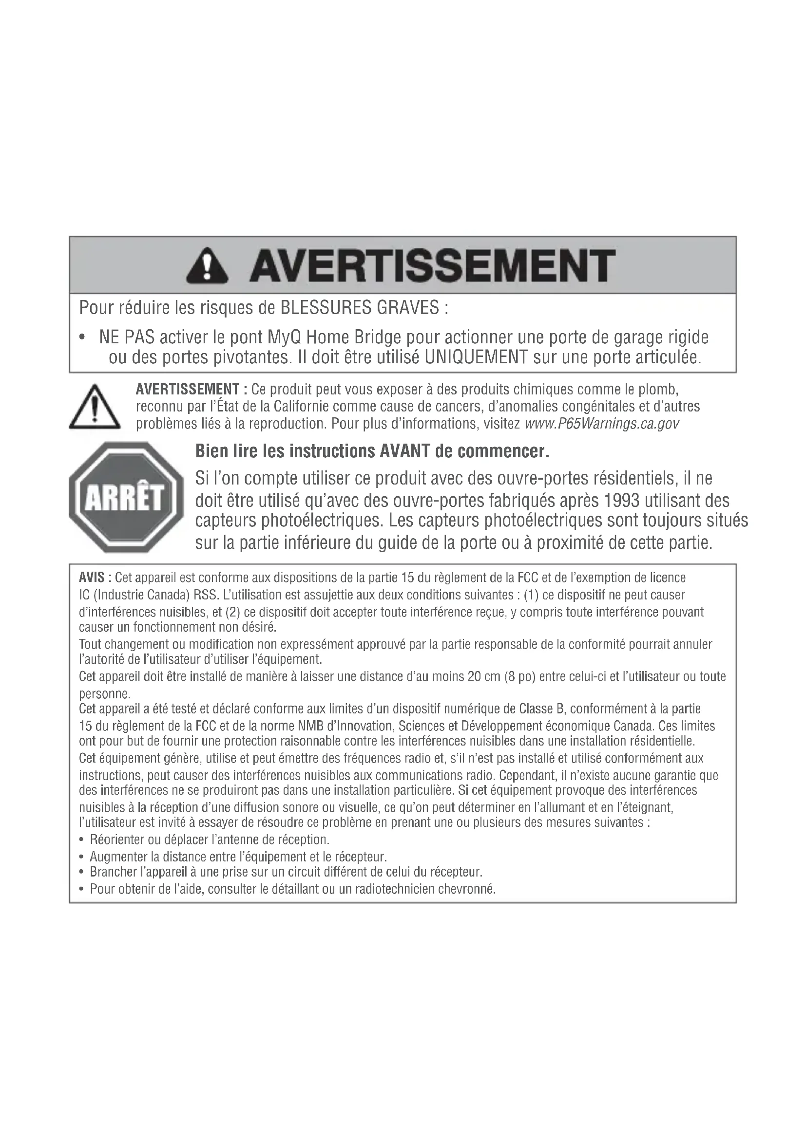 - NE PAS activer le pont MyQ Home Bridge pour actionner une porte de garage rigide ou des portes pivotantes. Il doit être utilisé UNIQUEMENT sur une porte articulée. Bien lire les instructions AVANT de commencer. Si l’on compte utiliser ce produit avec des ouvre-portes résidentiels, il ne doit être utilisé qu’avec des ouvre-portes fabriqués après 1993 utilisant des capteurs photoélectriques. Les capteurs photoélectriques sont toujours situés sur la partie inférieure du guide de la porte ou à proximité de cette partie. AVIS : Cet appareil est conforme aux dispositions de la partie 15 du règlement de la FCC et de l’exemption de licence IC (Industrie Canada) RSS. L’utilisation est assujettie aux deux conditions suivantes : (1) ce dispositif ne peut causer d’interférences nuisibles, et (2) ce dispositif doit accepter toute interférence reçue, y compris toute interférence pouvant causer un fonctionnement non désiré. Tout changement ou modifi cation non expressément approuvé par la partie responsable de la conformité pourrait annuler l’autorité de l’utilisateur d’utiliser l’équipement. Cet appareil doit être installé de manière à laisser une distance d’au moins 20 cm (8 po) entre celui-ci et l’utilisateur ou toute personne. Cet appareil a été testé et déclaré conforme aux limites d’un dispositif numérique de Classe B, conformément à la partie 15 du règlement de la FCC et de la norme NMB d’Innovation, Sciences et Développement économique Canada. Ces limites ont pour but de fournir une protection raisonnable contre les interférences nuisibles dans une installation résidentielle. Cet équipement génère, utilise et peut émettre des fréquences radio et, s’il n’est pas installé et utilisé conformément aux instructions, peut causer des interférences nuisibles aux communications radio. Cependant, il n’existe aucune garantie que des interférences ne se produiront pas dans une installation particulière. Si cet équipement provoque des interférences nuisibles à la réception d’une diffusion sonore ou visuelle, ce qu’on peut déterminer en l’allumant et en l’éteignant, l’utilisateur est invité à essayer de résoudre ce problème en prenant une ou plusieurs des mesures suivantes :
