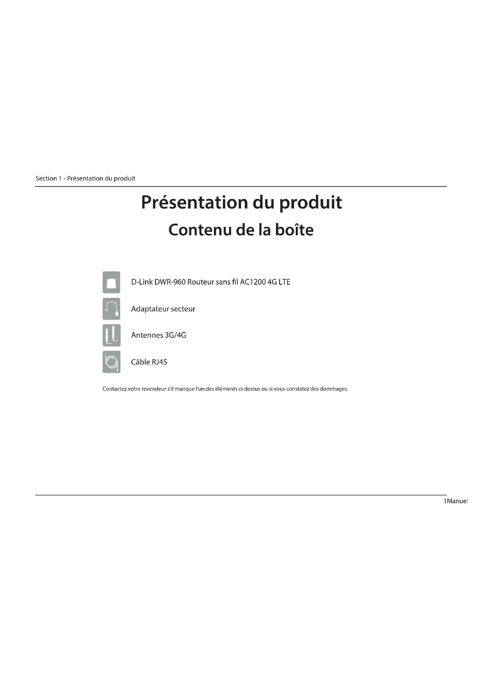 Présentation du produit Contenu de la boîte Contactez votre revendeur s'il manque l'un des éléments ci-dessus ou si vous constatez des dommages. Adaptateur secteur D-Link DWR-960 Routeur sans l AC1200 4G LTE Antennes 3G/4G Câble RJ452Manuel d’utilisation du DWR-960 D-Link