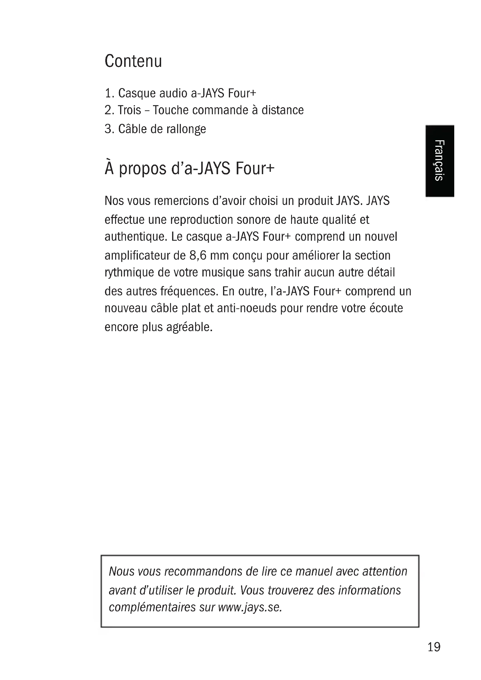 À propos d’a-JAYS Four+ Nos vous remercions d’avoir choisi un produit JAYS. JAYS effectue une reproduction sonore de haute qualité et authentique. Le casque a-JAYS Four+ comprend un nouvel amplicateur de 8,6 mm conçu pour améliorer la section rythmique de votre musique sans trahir aucun autre détail des autres fréquences. En outre, l’a-JAYS Four+ comprend un nouveau câble plat et anti-noeuds pour rendre votre écoute encore plus agréable. Nous vous recommandons de lire ce manuel avec attention avant d’utiliser le produit. Vous trouverez des informations complémentaires sur www.jays.se.20 Français Specications Amplicateur: 8,6 mm Dynamic Speaker Isolation: Système d’isolation sonore Sensibilité: 96dB SPL à 1kHz Impédance: 16 Ohm Fréquence de réponse: 20 - 21 000 Hz Longueur du cordon: 115 cm Poids: 17 grammes Fiche: Fiche stéréo 3,5 mm argentée Microphone: MEMS Technology21 Français Comprendre la spécication du produit Sound pressure, Decibel and Hz Le son est une vibration invisible constituée de fréquences qui voyagent en ondulations dénommées les ondes sonores. L’amplitude des vibrations produites par un objet tel qu’un amplicateur est proportionnelle à la modication de la pression générée lorsque l’onde se déplace au travers de l’élément qui l’environne (comme l’air). Par conséquent, l’amplitude d’une onde sonore est généralement mesurée par son niveau de pression. Le décibel est une échelle loga- rithmique non dimensionnelle permettant de dénoter une modication relative de la puissance d’un signal ou d’une onde. Si l’on se place dans le contexte d’un niveau de pres- sion sonore, il mesure le seuil nominal de l’ouïe humaine, par rapport au son le plus bas audible par l’oreille humaine. La fréquence des moments où une onde sonore atteint son pic au cours d’une durée donnée est mesurée en Hz (hertz). Ceci correspond au nombre total de cycles complets par secondes. L’ouïe humaine est limitée à des fréquences entre 20 Hz et 20 000 Hz. Sensibilité et impédance La sensibilité du casque est mesurée en Niveau de pression sonore (SPL). Ceci correspond essentiellement à une mesure de la façon dont le casque est réglé sur un niveau fort ou facile à régler. La sensibilité est également inuencée par l’impédance de la bobine de l’amplicateur qui varie sur la plage de fréquence. Plus le SPL est élevé et plus l’impédance est faible, plus votre casque sera souple.22 Français Précautions