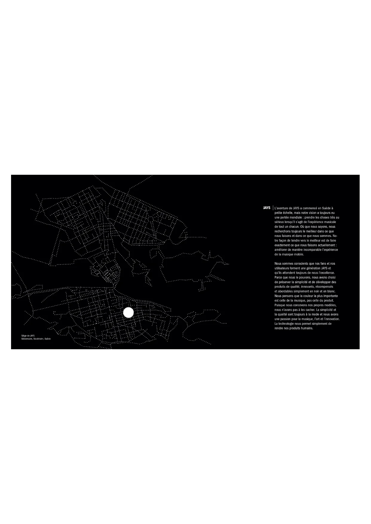 - Modication or repair by you or third party without JAYS AB approval. How to get Warranty Service If you wish to make a Warranty Claim within the Limited Warranty Period, please contact the reseller of your product for further help. (For products sold in the USA and Australia, please see the distributor details at www.jays.se. You will need to provide the proof of purchase and the affected part. Any defective parts covered by the Limited Warranty will be repaired or replaced free of charge. Replaced or repaired parts provided during the Warranty Period will be warranted for the remainder of the original Warranty Period or for sixty (60) days from the date of repair or replacement, whichever is longer. For FAQ please visit www.jays.se. ENGLISH 2524FRANÇAIS Legal notice JAYS, JAYS of Sweden, by JAYS and a-JAYS are ei- ther registered trademarks or trademarks of JAYS AB (Publ) in the EU and/or other countries. “Made for iPod,” “Made for iPhone,” and “Made for iPad” mean that an electronic accessory has been designed to connect specically to iPod, iPhone, or iPad, respectively, and has been certi- ed by the developer to meet Apple performance standards. Apple is not responsible for the operation of this device or its compliance with safety and regulatory standards. Please note that the use of this accessory with iPod, iPhone, or iPad may affect wireless performance. 2726Siège de JAYS Södermalm, Stockholm, Suède L’aventure de JAYS a commencé en Suède à petite échelle, mais notre vision a toujours eu une portée mondiale: prendre les choses très au sérieux lorsqu’il s’agit de l’expérience musicale de tout un chacun. Où que nous soyons, nous recherchons toujours le meilleur dans ce que nous faisons et dans ce que nous sommes. No- tre façon de tendre vers le meilleur est de faire exactement ce que nous faisons actuellement: améliorer de manière incomparable l’expérience de la musique mobile. Nous sommes conscients que nos fans et nos utilisateurs forment une génération JAYS et qu’ils attendent toujours de nous l’excellence. Parce que nous le pouvons, nous avons choisi de préserver la simplicité et de développer des produits de qualité, innovants, récompensés et abordables simplement en noir et en blanc. Nous pensons que la couleur la plus importante est celle de la musique, pas celle du produit. Puisque nous concevons nos propres modèles, nous n’avons pas à les cacher. La simplicité et la qualité sont toujours à la mode et nous avons une passion pour la musique, l’art et l’innovation. La technologie nous permet simplement de rendre nos produits humains. JAYSÀ PROPOS DES ÉCOUTEURS a-JAYS FIVE Nous voulions bousculer les normes actuelles en matière d’écouteurs intra-auriculaires. Nous souhaitions proposer une meilleure alternative pour les consommateurs et inventer de nouveaux écouteurs qui offriraient de meilleures performances, qui seraient plus confortables à utiliser et qui dureraient plus longtemps. Avec cela en tête, nous nous sommes lancés dans la conception des écouteurs a-JAYS Five. Les écouteurs que vous avez devant vous sont le résultat de 12 mois de développement intense. Les écouteurs a-JAYS Five sont fabriqués en aluminium tourné haute précision avec un revêtement en élastomère thermoplastique exible formé d’une seule pièce pour une expérience produit excellente et une grande durabilité. Le corps ergonomique parfaitement équilibré et prolé des écouteurs contient un pilote personnalisé nement réglé qui délivre une dynamique sonore riche et détaillée avec des basses précises et puissantes convenant à tout type de musique. Tout est fait pour vous apporter la meilleure expérience possible. Merci d’avoir choisi les écouteurs a-JAYS Five. 30 31FRANÇAIS CONTENU