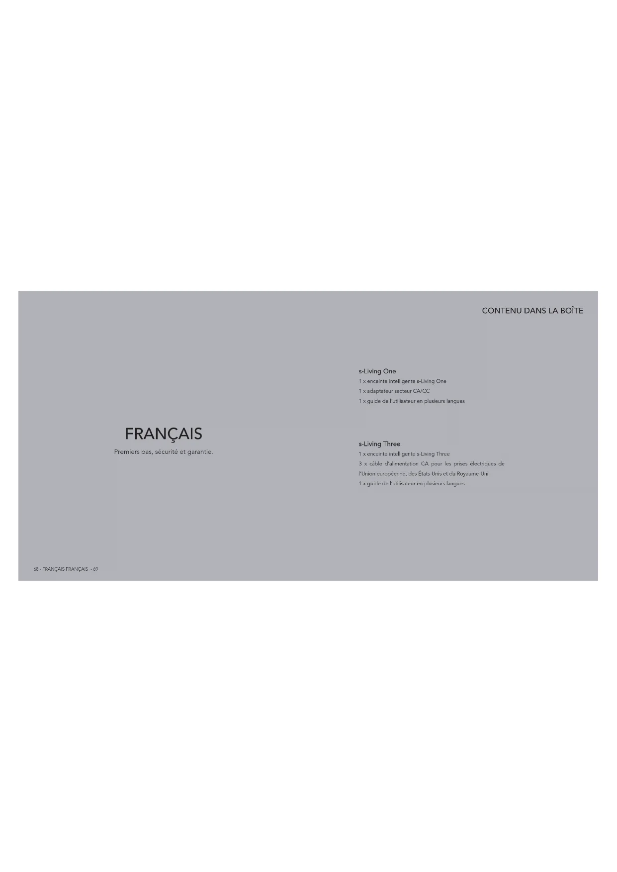 - Ziehen Sie vor der Reinigung Ihres Lautsprechers stets den Netzstecker. Reinigen Sie das Gerät niemals mit Flüssigkeiten oder Chemikalien.68 - FRANÇAIS FRANÇAIS - 69 FRANÇAIS Premiers pas, sécurité et garantie. s-Living One s-Living Three 1 x enceinte intelligente s-Living One 1 x adaptateur secteur CA/CC 1 x guide de l’utilisateur en plusieurs langues 1 x enceinte intelligente s-Living Three 3 x câble d’alimentation CA pour les prises électriques de l’Union européenne, des États-Unis et du Royaume-Uni 1 x guide de l’utilisateur en plusieurs langues CONTENU DANS LA BOÎTE70 - FRANÇAIS FRANÇAIS - 71 ALLUMEZ VOTRE ENCEINTE s-LIVING ALLUMEZ VOTRE ENCEINTE s-LIVING