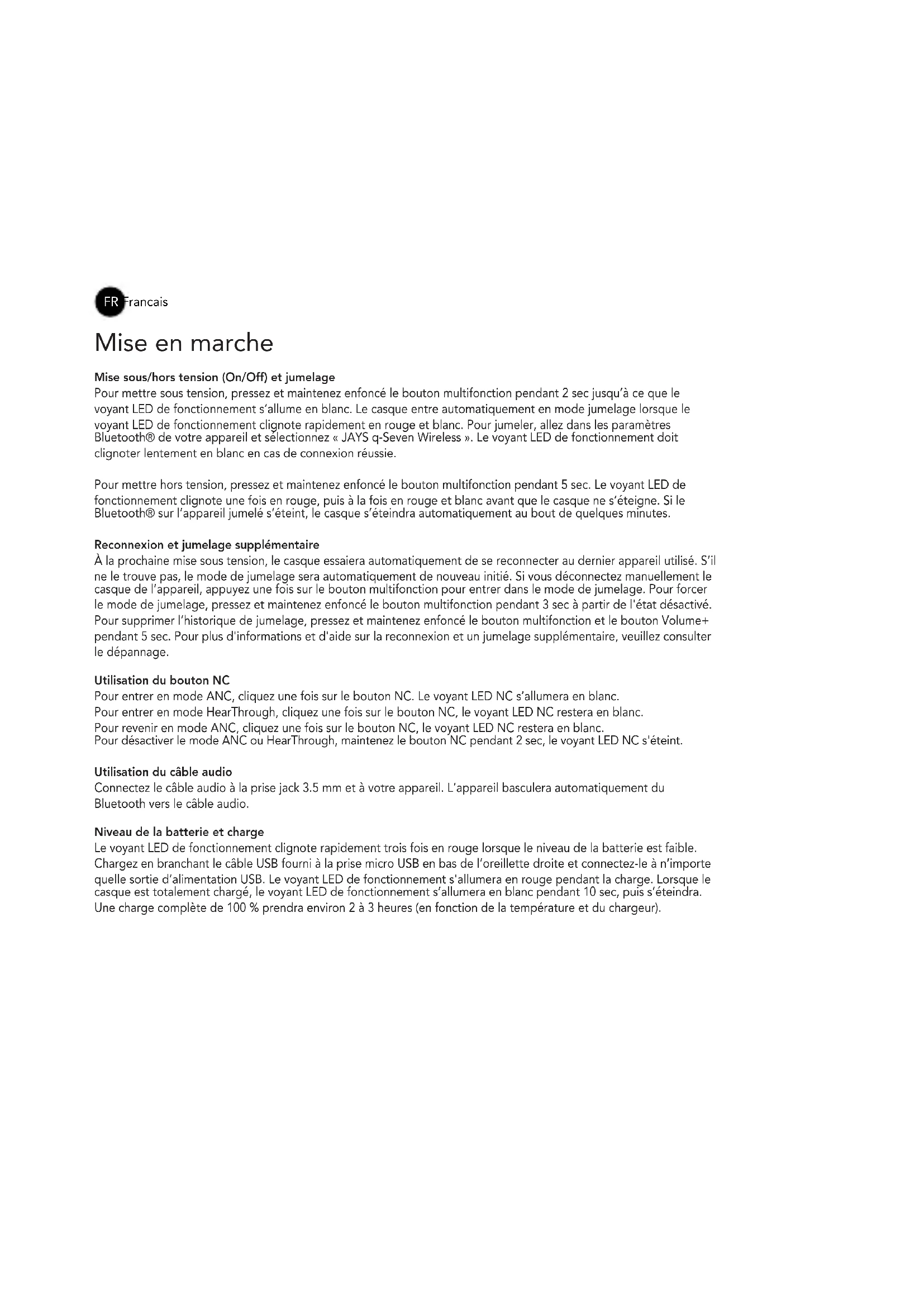 godkännande av Northbaze Group AB. Hur garantin hanteras Kontakta i första hand inköpsstället om du önskar reklamera din produkt inom den begränsade garantiperioden. Du måste kunna uppvisa ett giltigt kvitto samt produkten du önskar reklamera. Produkten och de delar som innefattas av garantin kommer att bytas ut eller repareras. Produkt eller tillbehör som byts ut eller repareras under garantiperioden täcks av kvarvarande garantiperioden eller 60 dagar från och med utbytes- eller reparationsdatumet beroende av vilket som är längst. För FAQ vänligen besök www.jaysheadphones.com.FR Francais Mise en marche Mise sous/hors tension (On/Off) et jumelage Pour mettre sous tension, pressez et maintenez enfoncé le bouton multifonction pendant 2 sec jusqu’à ce que le voyant LED de fonctionnement s’allume en blanc. Le casque entre automatiquement en mode jumelage lorsque le voyant LED de fonctionnement clignote rapidement en rouge et blanc. Pour jumeler, allez dans les paramètres Bluetooth® de votre appareil et sélectionnez « JAYS q-Seven Wireless ». Le voyant LED de fonctionnement doit clignoter lentement en blanc en cas de connexion réussie. Pour mettre hors tension, pressez et maintenez enfoncé le bouton multifonction pendant 5 sec. Le voyant LED de fonctionnement clignote une fois en rouge, puis à la fois en rouge et blanc avant que le casque ne s’éteigne. Si le Bluetooth® sur l’appareil jumelé s’éteint, le casque s’éteindra automatiquement au bout de quelques minutes. Reconnexion et jumelage supplémentaire À la prochaine mise sous tension, le casque essaiera automatiquement de se reconnecter au dernier appareil utilisé. S’il ne le trouve pas, le mode de jumelage sera automatiquement de nouveau initié. Si vous déconnectez manuellement le casque de l’appareil, appuyez une fois sur le bouton multifonction pour entrer dans le mode de jumelage. Pour forcer le mode de jumelage, pressez et maintenez enfoncé le bouton multifonction pendant 3 sec à partir de l'état désactivé. Pour supprimer l’historique de jumelage, pressez et maintenez enfoncé le bouton multifonction et le bouton Volume+ pendant 5 sec. Pour plus d'informations et d'aide sur la reconnexion et un jumelage supplémentaire, veuillez consulter le dépannage. Utilisation du bouton NC Pour entrer en mode ANC, cliquez une fois sur le bouton NC. Le voyant LED NC s’allumera en blanc. Pour entrer en mode HearThrough, cliquez une fois sur le bouton NC, le voyant LED NC restera en blanc. Pour revenir en mode ANC, cliquez une fois sur le bouton NC, le voyant LED NC restera en blanc. Pour désactiver le mode ANC ou HearThrough, maintenez le bouton NC pendant 2 sec, le voyant LED NC s'éteint. Utilisation du câble audio Connectez le câble audio à la prise jack 3.5 mm et à votre appareil. L’appareil basculera automatiquement du Bluetooth vers le câble audio. Niveau de la batterie et charge Le voyant LED de fonctionnement clignote rapidement trois fois en rouge lorsque le niveau de la batterie est faible. Chargez en branchant le câble USB fourni à la prise micro USB en bas de l’oreillette droite et connectez-le à n’importe quelle sortie d’alimentation USB. Le voyant LED de fonctionnement s'allumera en rouge pendant la charge. Lorsque le casque est totalement chargé, le voyant LED de fonctionnement s’allumera en blanc pendant 10 sec, puis s’éteindra. Une charge complète de 100 % prendra environ 2 à 3 heures (en fonction de la température et du chargeur).Fonctions des boutons et voyants LED Utilisation du bouton multifonction Fonction Répondre / Mettre fin à l'appel Rappel du dernier appelant Rejeter l’appel Commande vocale Lecture / Pause de la musique Mettre sous tension Mettre hors tension Effacer la liste Bluetooth Fonctionnement Bouton multifonction à clic unique Bouton multifonction à triple clic Appuyez sur le bouton multifonction pendant 2 sec Bouton multifonction à double clic Bouton multifonction à clic unique Appuyez sur le bouton multifonction pendant 2 sec Appuyez sur le bouton multifonction pendant 5 sec Appuyez sur le bouton multifonction et volume+ pendant 5 sec Voyant LED de fonctionnement Explication Mettre sous tension Mettre hors tension En veille Batterie faible Pendant le chargement Chargement terminé LED de fonctionnement Clignote en blanc Clignote en rouge / blanc Clignote en blanc Clignote en rouge Lumière rouge fixe Clignote en blanc Explication Mode de jumelage Bluetooth® Connexion au Bluetooth® réussie Connexion au Bluetooth® perdue Nettoyer la liste Bluetooth® Appel entrant LED de fonctionnement Clignote en rouge / blanc Clignote en blanc Clignote en rouge / blanc Clignote en blanc Clignote en blanc Voyant LED de fonctionnementDépannage Problème de jumelage et de connexion