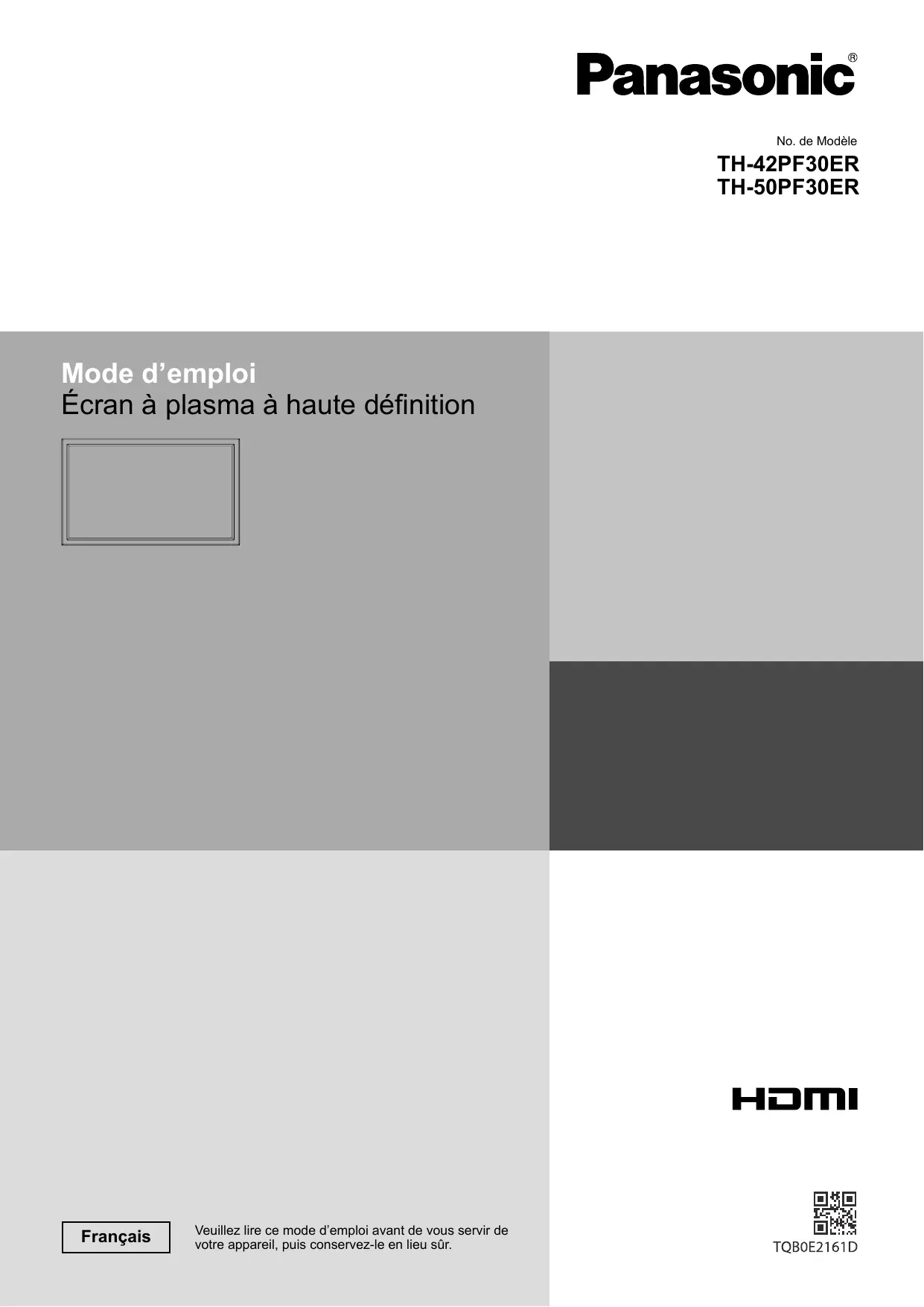 - No. de Modèle TH-42PF30ER TH-50PF30ER Mode d’emploi Écran à plasma à haute définition Français Veuillez lire ce mode d’emploi avant de vous servir de votre appareil, puis conservez-le en lieu sûr. Cher Client Panasonic Bienvenue dans la famille des clients de Panasonic. Nous espérons que votre nouvel l’écran à plasma vous offrira de longues années de plaisir. Pour profiter au maximum des possibilités de votre appareil, veuillez lire attentivement le présent mode d’emploi avant d’entreprendre les réglages, et conservez-le pour pouvoir vous y référer en cas de besoin. Veuillez aussi conserver votre reçu, et noter le numéro de modèle et le numéro de série de votre appareil dans l’espace réservé sur la couverture de dos de ce mode d’emploi. Visitez le site Panasonic http://panasonic.net Sommaire Notice de sécurité importante p. 3