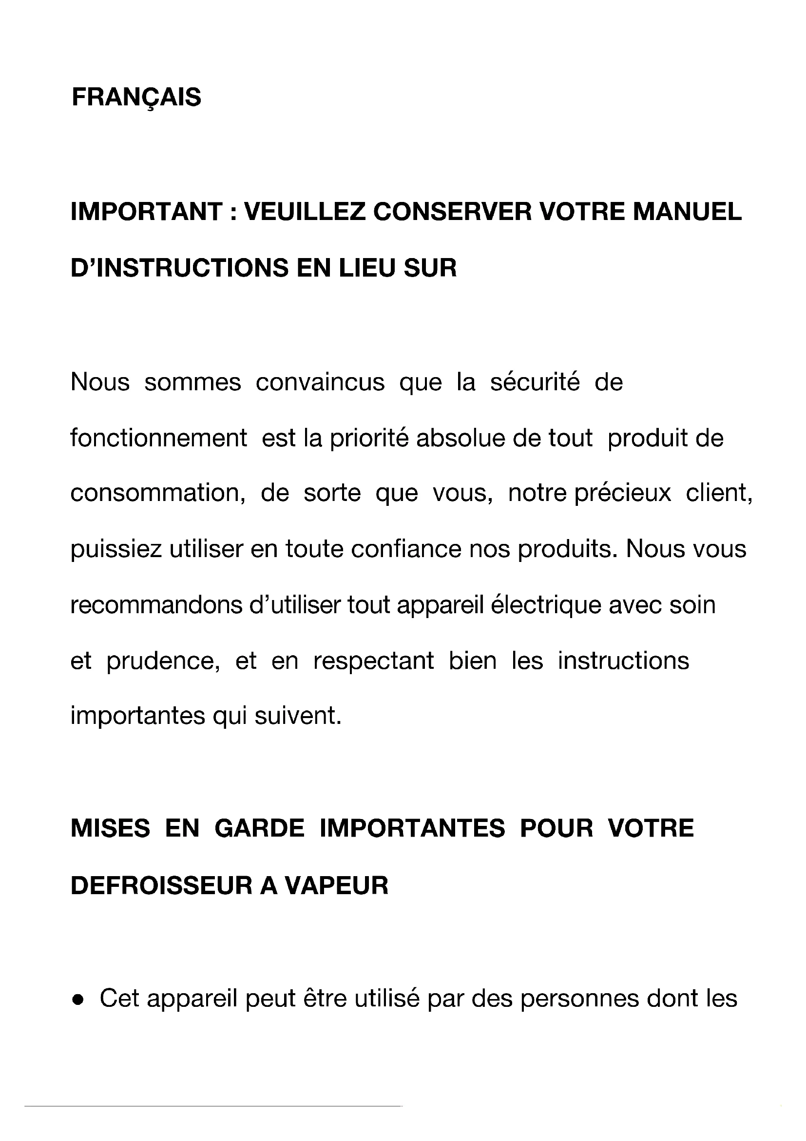 ● Cet appareil peut être utilisé par des personnes dont lescapacités physiques, sensorielles ou mentales sont réduites ou dont l’expérience ou les connaissances ne sont pas suffisantes, à condition qu’elles bénéficient d’une surveillance ou qu’elles aient reçu des instructions quant à l’utilisation de l’appareil en toute sécurité et qu’elles en comprennent bien les dangers potentiels. ● N’utilisez pas cet appareil si le cordon d'alimentation ou la fiche est endommagée, s'il ne fonctionne pas correctement ou s'il a été endommagé ou est tombé. Si le cordon d’alimentation est endommagé, celui-ci doit être remplacé par le fabricant, son représentant ou toute personne de même qualification afin d’éviter tout accident. ● Cet appareil doit être utilisé avec précaution car il émet de la vapeur. ● Débranchez toujours le défroisseur à vapeur avant de monter/démonter la brosse, pendant le remplissage, lenettoyage et le détartrage. ● Lisez attentivement le manuel d’instructions avant d’utiliser le défroisseur à vapeur pour la première fois et conservez-le en lieu sûr. ● Tout entretien autre que le nettoyage ne doit être effectué que par un service technique agréé. ● Retirez et jetez dans une déchetterie tous les matériaux d’emballage et les étiquettes publicitaires avant d’utiliser le défroisseur à vapeur pour la première fois. ● Pour éviter tout risque d’électrocution par les jeunes enfants, retirez et jetez en lieu sûr la protection de la prise d'alimentation. ● Ne placez pas le défroisseur à vapeur près du bord d'un comptoir ou d'une table pendant le fonctionnement. Assurez-vous que la surface soit plane, propre et sèche. ● Assurez-vous toujours que le défroisseur à vapeur soit correctement assemblé avant son utilisation. Employez uniquement les pièces ou accessoires fournis etspécifiés dans ce manuel. Suivez les instructions fournies dans ce manuel. ● N’utilisez pas le défroisseur à l'extérieur ou dans une salle de bain. ● Ne laissez pas le défroisseur à vapeur sans surveillance lorsqu'il est connecté ou en cours d'utilisation. ● Si le défroisseur à vapeur n'est pas utilisé pendant une période prolongée, débranchez-le de la prise de courant. ● Laissez le défroisseur à vapeur refroidir complètement avant de le ranger. ● Placez toujours le défroisseur à vapeur sur sa base lorsque vous le rangez. Ne laissez pas l’appareil sans surveillance quand il est branché. ● Ne rangez pas le défroisseur avec de l’eau dans le réservoir. Videz toujours le réservoir après utilisation. ● Ne touchez pas les surfaces chaudes. Cet appareil permet à l'utilisateur de défroisser les vêtements avec un grand débit de vapeur. Des températures élevées sontatteintes pendant l'utilisation, ce qui peut causer des brûlures. Placez toujours vos mains sur le manche du défroisseur lorsque vous le tenez et avertissez les autres (en particulier les enfants) des dangers possibles de brûlure par la vapeur, l’eau chaude ou des parties chaudes, en particulier lorsque l’appareil est en position verticale. ● Rangez le défroisseur à vapeur hors de portée des enfants. ● Le défroisseur à vapeur doit être utilisé et posé sur une surface stable. ● Lorsque vous placez le défroisseur à vapeur sur sa base, assurez-vous que la surface sur laquelle il est posé soit stable. ● Le défroisseur à vapeur ne doit pas être utilisé s'il est tombé, s'il présente des signes visibles de dommages ou s'il fuit. ● Le défroisseur de vêtements est conçu pour un usagedomestique et pour être utilisé avec l'eau du robinet ; ne mettez pas de parfum, de vinaigre ou d’autres produits chimiques dans le réservoir. Cet appareil n'est pas conçu pour fonctionner avec ces produits chimiques. ● Ne touchez pas la tête du défroisseur pendant l’utilisation. Lorsque vous employez le défroisseur à vapeur, assurez-vous que sa tête soit orientée loin de vous et dans une position verticale. ● Testez toujours le défroisseur à vapeur sur une partie discrète du vêtement pour vous assurer que la température n’est pas trop élevée pour le tissu. ● Pour éviter d'endommager le défroisseur à vapeur, n’utilisez pas de détergent alcalin lors du nettoyage; utilisez un chiffon doux et un détergent doux. ● Le défroisseur produit de la vapeur brûlante. Ne touchez pas la tête de l’appareil pendant l'utilisation. Lorsque vous employez le défroisseur à vapeur, assurez-vous que la tête soit dirigée dans le sens opposé à vous et enposition verticale. ● Le défroisseur à vapeur comporte un coupe-circuit thermique de sécurité pour le protéger de la surchauffe. Cependant, il ne doit pas être laissé sans surveillance pendant qu'il est branché à la prise de courant. Des précautions particulières doivent toujours être prises lorsque des enfants se trouvent à la maison ou à proximité de l’appareil. ● Ne remplissez pas le réservoir d'eau au-delà de l'indicateur MAX, au risque de provoquer un écoulement d'eau. ● Il peut y avoir des écoulements de la tête si la température de l’eau n’est pas suffisamment élevée pour créer de la vapeur. Par conséquent, assurez-vous que le défroisseur soit toujours préchauffé pendant 2-3 minutes avant de l'utiliser. ● N'utilisez jamais le défroisseur à vapeur sur les vêtements que vous portez et ne dirigez pas la vapeurvers des personnes ou des animaux. ● Ne laissez pas le cordon toucher des surfaces chaudes. ● Nettoyez le défroisseur à vapeur en suivant les instructions de nettoyage fournies dans ce manuel. ● N'utilisez jamais le fer tourné vers quelqu‘un. La vapeur peut causer des brûlures. ● Le liquide ou de la vapeur ne doivent pas être dirigé vers des équipements comportant des composants électriques, tels que l’intérieur des fours.MISES EN GARDE IMPORTANTES POUR TOUS LES APP