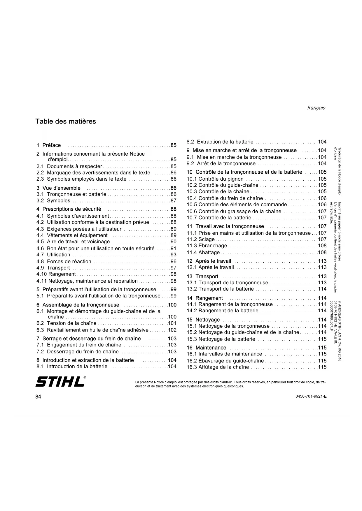Les symboles d'avertissement qui peuvent être appliqués sur la tronçonneuse et la batterie ont les significations suivantes: Ce symbole indique le sens de rotation de la chaîne. Tourner dans ce sens de rotation pour tendre la chaîne. Ce symbole repère le réservoir à huile de chaîne adhésive. Dans ce sens, on engage le frein de chaîne.0458-701-9921-E