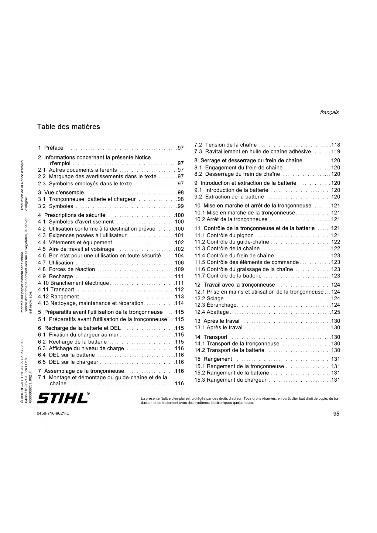 Un rebond peut se produire si le nez du guide-chaîne touche un objet ou si le bois à couper fléchit et pince la chaîne dans la coupe. Dans bien des cas, un contact avec le nez du guide-chaîne peut causer soudainement une réaction vers l'arrière, de telle sorte que le guide-chaîne rebondit en décrivant un arc de cercle vers le haut et en direction de l'utilisateur. Lors d'une coupe avec le dessus du guide-chaîne, un coincement de la chaîne peut provoquer un contrecoup, c'est-à-dire repousser brusquement le guide-chaîne en direction de l'utilisateur. Chacune de ces réactions peut avoir pour effet que l'utilisateur perde le contrôle de la scie à chaîne et risque d'être grièvement blessé. Ne pas se fier uniquement aux dispositifs de sécurité installés sur la scie à chaîne. L'utilisateur d'une scie à chaîne devrait prendre différentes mesures de sécurité pour pouvoir travailler sans accident, ni blessures. Un rebond est la conséquence d'une utilisation incorrecte ou inadéquate de l'outil électroportatif. Il est possible de l'éviter en prenant les précautions qui s'imposent, décrites ci- après: – Tenir la scie à chaîne à deux mains et empoigner soigneusement les poignées, en les entourant avec les pouces. Tenir le corps et les bras dans la position idéale pour pouvoir résister aux forces de rebond. En prenant les précautions adéquates, l'utilisateur peut maîtriser les forces de rebond. Ne jamais lâcher la scie à chaîne. – Éviter toute position anormale du corps et ne pas scier à bras levés. Cette précaution évite le risque d'entrer accidentellement en contact avec le nez du guide-chaîne et permet de mieux maîtriser la scie à chaîne dans des situations inattendues. – Utiliser exclusivement les guide-chaînes et chaînes de rechange prescrits par le fabricant. L'utilisation de guide- chaînes ou de chaînes de rechange qui ne conviennent pas peut entraîner la rupture de la chaîne et/ou un plus grand risque de rebond. – Pour l'affûtage et la maintenance de la chaîne de tronçonneuse, suivre les instructions du fabricant. Des limiteurs de profondeur dont la hauteur a été trop réduite augmentent la tendance au rebond.Traduzione delle istruzioni per l'uso originaliStampato su carta candeggiata senza cloro.I colori di stampa contengono oli vegetali; la carta è riciclabile.© ANDREAS STIHL AG & Co. KG 20180458-716-9621-C. VA1.C18. 0000008051_002_I 0458-716-9621-C italiano