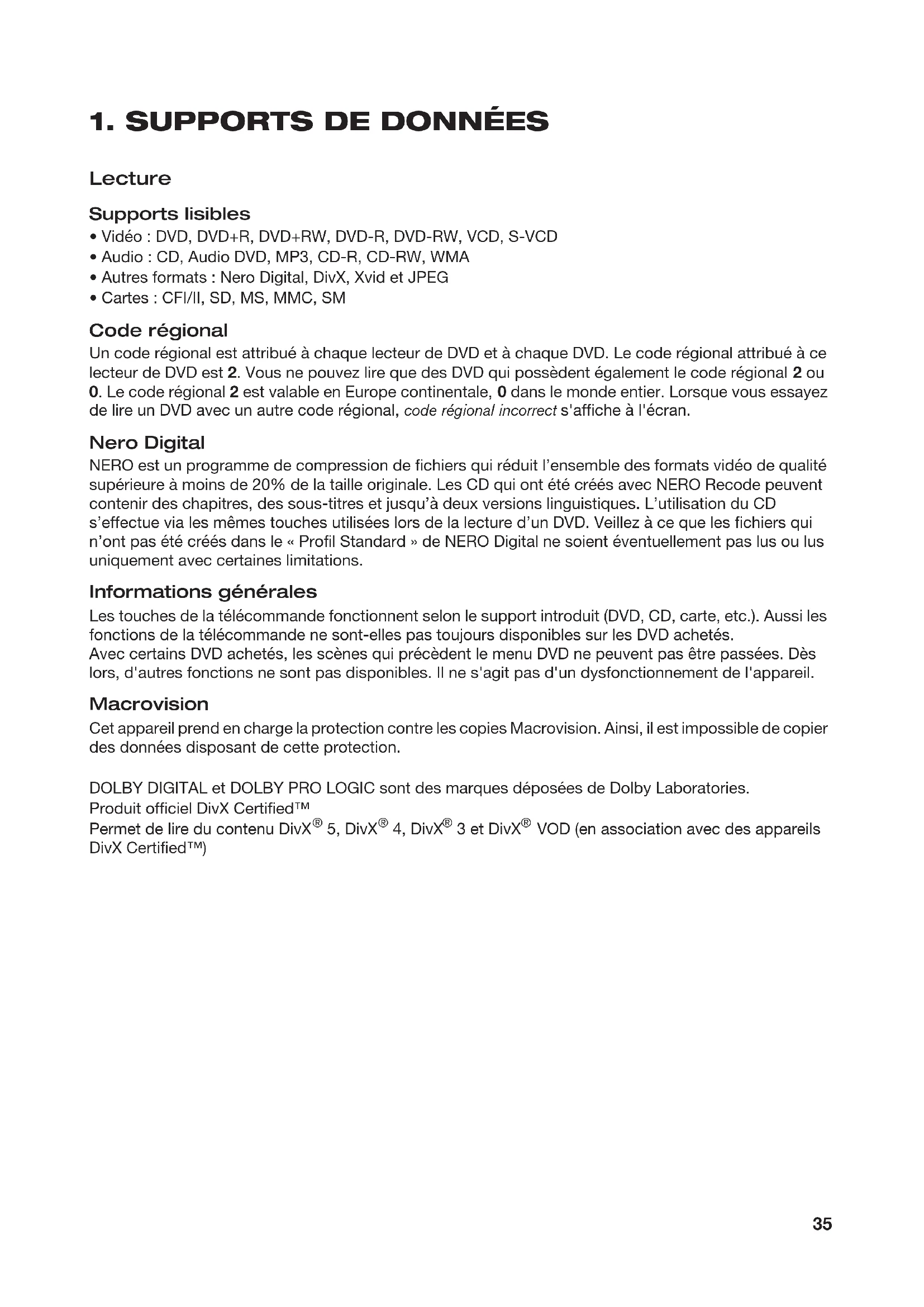 de lire un DVD avec un autre code régional, code régional incorrect s'affiche à l'écran. Nero Digital NERO est un programme de compression de fichiers qui réduit l’ensemble des formats vidéo de qualité supérieure à moins de 20% de la taille originale. Les CD qui ont été créés avec NERO Recode peuvent contenir des chapitres, des sous-titres et jusqu’à deux versions linguistiques. L’utilisation du CD s’effectue via les mêmes touches utilisées lors de la lecture d’un DVD. Veillez à ce que les fichiers qui n’ont pas été créés dans le « Profil Standard » de NERO Digital ne soient éventuellement pas lus ou lus uniquement avec certaines limitations. Informations générales Les touches de la télécommande fonctionnent selon le support introduit (DVD, CD, carte, etc.). Aussi les fonctions de la télécommande ne sont-elles pas toujours disponibles sur les DVD achetés. Avec certains DVD achetés, les scènes qui précèdent le menu DVD ne peuvent pas être passées. Dès lors, d'autres fonctions ne sont pas disponibles. Il ne s'agit pas d'un dysfonctionnement de l'appareil. Macrovision Cet appareil prend en charge la protection contre les copies Macrovision. Ainsi, il est impossible de copier des données disposant de cette protection. DOLBY DIGITAL et DOLBY PRO LOGIC sont des marques déposées de Dolby Laboratories. Produit officiel DivX Certified™ Permet de lire du contenu DivX