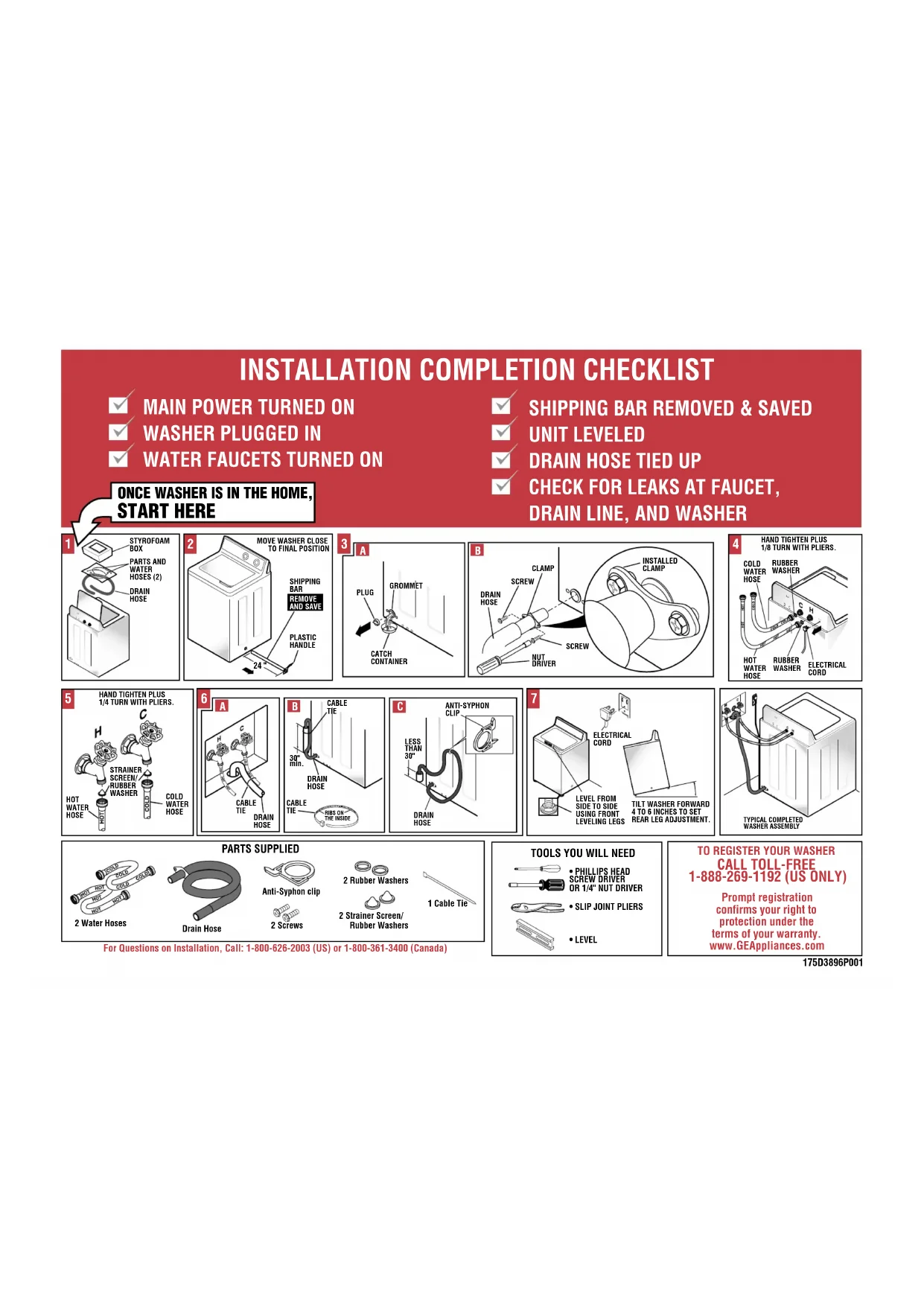 (150 psi). TEMPÉRATURE D’EAU – Le chauffe-eau domestique doit être réglé de façon à alimenter LA MACHINE À LAVER avec de l’eau chaude entre 50 °C et 65 °C (120 °F et 150 °F) quand on choisit le mode “ hot wash “ (lavage à chaud). ROBINETS D’ARRÊT – Des robinets d’arrêt d’eau chaude et d’eau froide doivent être prévus. ÉVACUATION – L’eau de vidange peut être soit évacuée au moyen d’un tuyau de POUR ENREGISTRER VOTRE MACHINE À LAVER, COMPOSEZ LE NUMÉRO SANS FRAIS SUIVANT : 1-888-269-1192 (ÉTATS-UNIS UNIQUEMENT) Enregistrez votre machine sans tarder pour confirmer vos droits de protection au titre de la garantie. www.GEAppliances.com Pour toute question au sujet de l’installation, veuillez composer le 1-800-626-2003 (États-Unis) ou le 1-800-361-3400 (Canada).