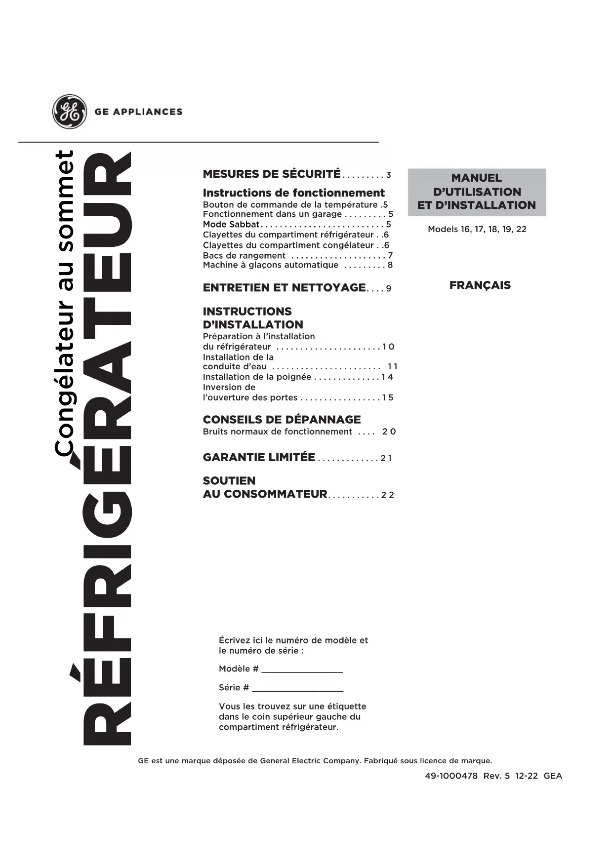 SOUTIEN AU CONSOMMATEUR ...........22 FRANÇAIS Écrivez ici le numéro de modèle et le numéro de série : Modèle # ________________ Série # __________________ Vous les trouvez sur une étiquette dans le coin supérieur gauche du compartiment réfrigérateur. 49-1000478 Rev. 5 12-22 GEA Models 16, 17, 18, 19, 22 MANUEL D’UTILISATION