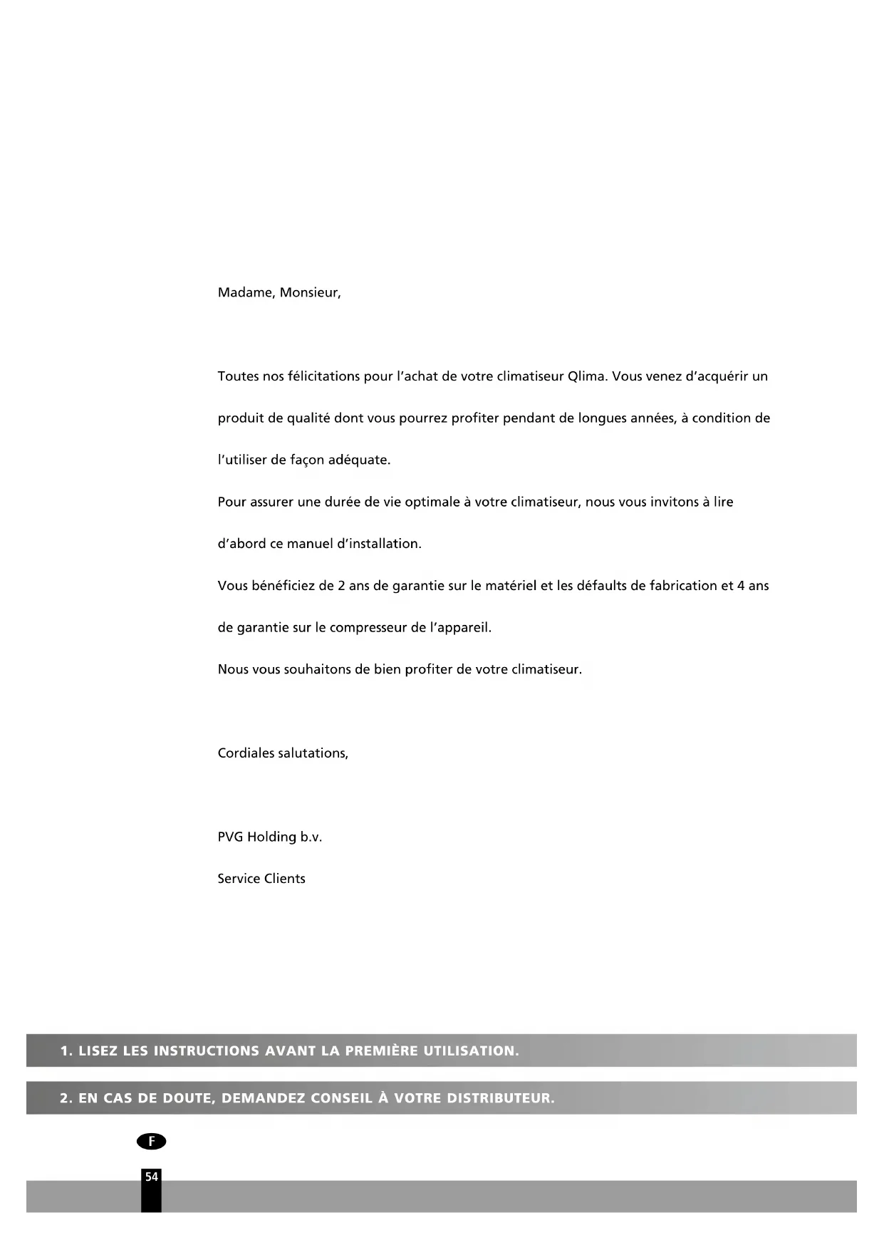 Madame, Monsieur, Toutes nos félicitations pour l’achat de votre climatiseur Qlima. Vous venez d’acquérir un produit de qualité dont vous pourrez profiter pendant de longues années, à condition de l’utiliser de façon adéquate. Pour assurer une durée de vie optimale à votre climatiseur, nous vous invitons à lire d’abord ce manuel d’installation. Vous bénéficiez de 2 ans de garantie sur le matériel et les défaults de fabrication et 4 ans de garantie sur le compresseur de l’appareil. Nous vous souhaitons de bien profiter de votre climatiseur. Cordiales salutations, PVG Holding b.v. Service Clients55