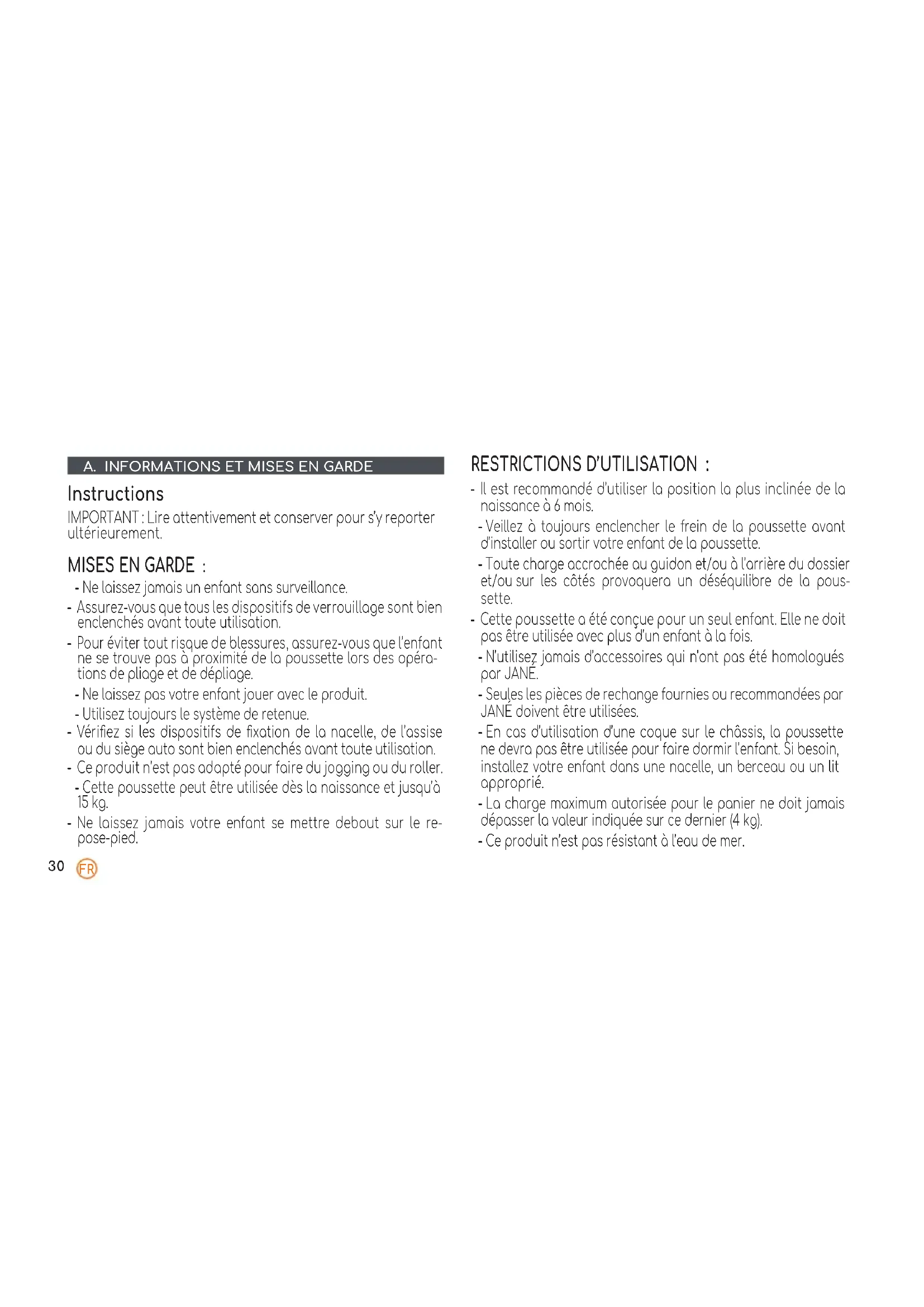 Instructions IMPORTANT : Lire attentivement et conserver pour s’y reporter ultérieurement. MISES EN GARDE : - Ne laissez jamais un enfant sans surveillance. - Assurez-vous que tous les dispositifs de verrouillage sont bien enclenchés avant toute utilisation. - Pour éviter tout risque de blessures, assurez-vous que l’enfant ne se trouve pas à proximité de la poussette lors des opéra- tions de pliage et de dépliage. - Ne laissez pas votre enfant jouer avec le produit. - Utilisez toujours le système de retenue. - Vériez si les dispositifs de xation de la nacelle, de l’assise ou du siège auto sont bien enclenchés avant toute utilisation. - Ce produit n’est pas adapté pour faire du jogging ou du roller. - Cette poussette peut être utilisée dès la naissance et jusqu’à 15 kg. - Ne laissez jamais votre enfant se mettre debout sur le re- pose-pied. RESTRICTIONS D’UTILISATION : - Il est recommandé d’utiliser la position la plus inclinée de la naissance à 6 mois. - Veillez à toujours enclencher le frein de la poussette avant d’installer ou sortir votre enfant de la poussette. - Toute charge accrochée au guidon et/ou à l’arrière du dossier et/ou sur les côtés provoquera un déséquilibre de la pous- sette. - Cette poussette a été conçue pour un seul enfant. Elle ne doit pas être utilisée avec plus d’un enfant à la fois. - N’utilisez jamais d’accessoires qui n’ont pas été homologués par JANÉ. - Seules les pièces de rechange fournies ou recommandées par JANÉ doivent être utilisées. - En cas d’utilisation d’une coque sur le châssis, la poussette ne devra pas être utilisée pour faire dormir l’enfant. Si besoin, installez votre enfant dans une nacelle, un berceau ou un lit approprié. - La charge maximum autorisée pour le panier ne doit jamais dépasser la valeur indiquée sur ce dernier (4 kg). - Ce produit n’est pas résistant à l’eau de mer.31