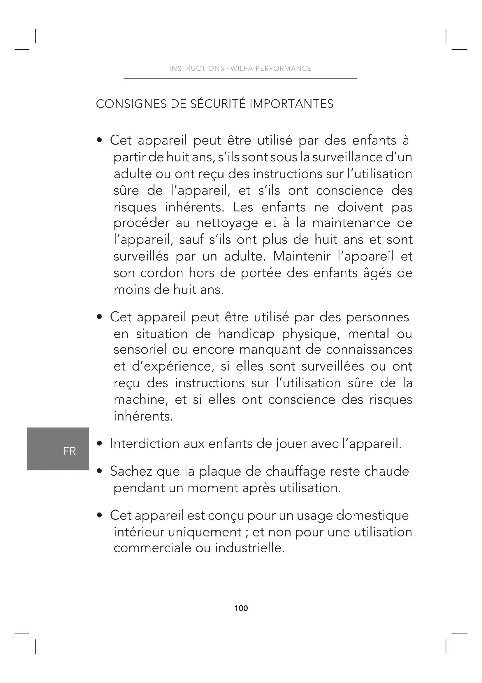- Cet appareil peut être utilisé par des enfants à partir de huit ans, s’ils sont sous la surveillance d’un adulte ou ont reçu des instructions sur l’utilisation sûre de l’appareil, et s’ils ont conscience des risques inhérents. Les enfants ne doivent pas procéder au nettoyage et à la maintenance de l’appareil, sauf s’ils ont plus de huit ans et sont surveillés par un adulte. Maintenir l’appareil et son cordon hors de portée des enfants âgés de moins de huit ans.