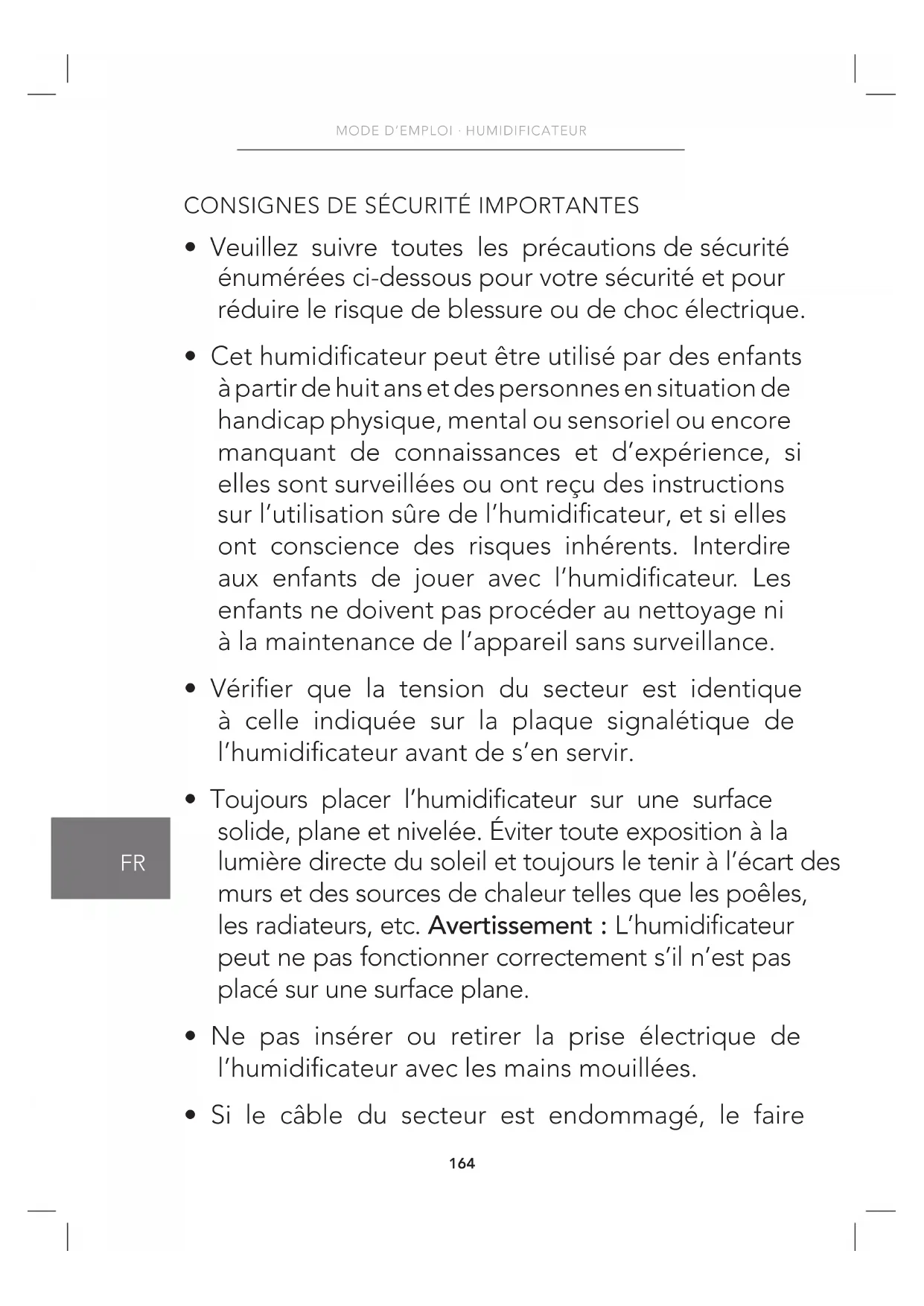 - Ne pas plonger l’humidicateur, le câble d’alimentation ou la prise dans de l’eau ou d’autres liquides.166