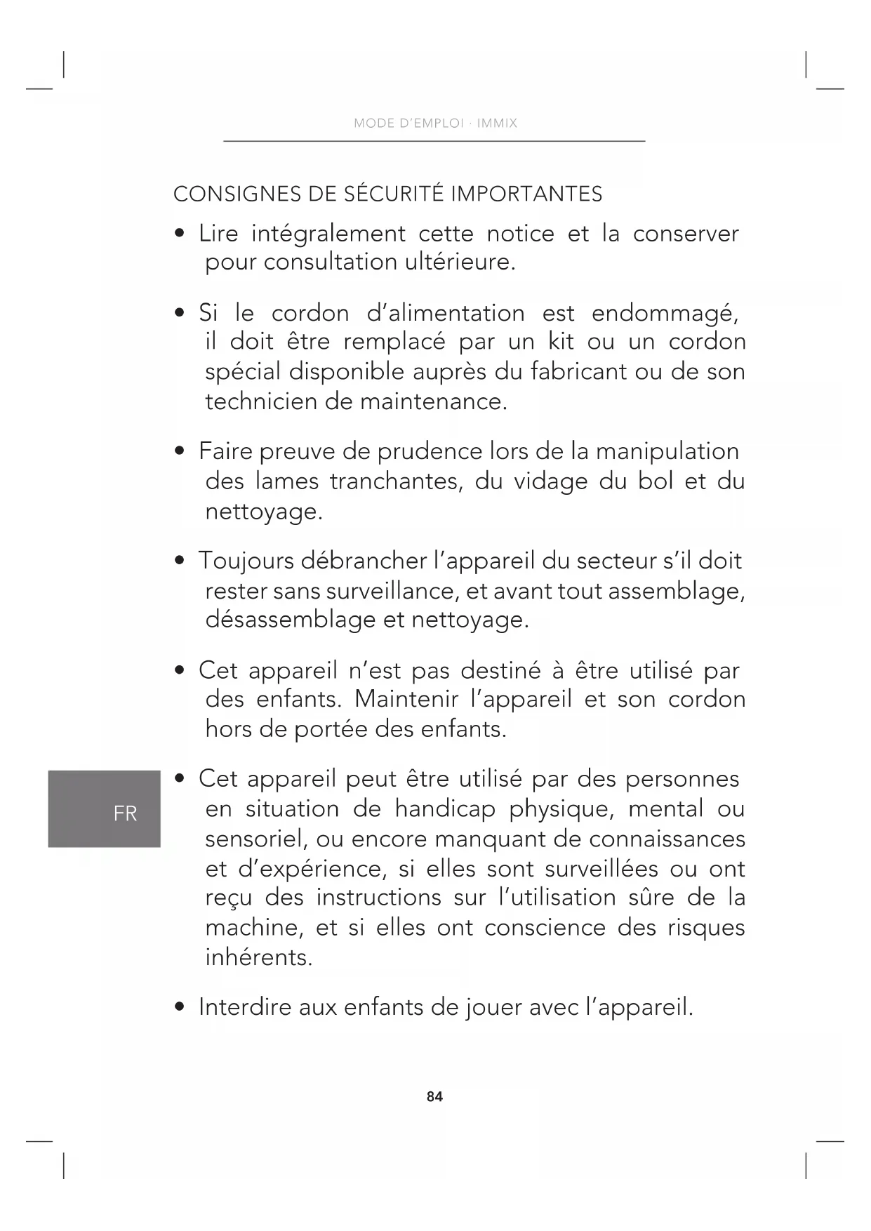 - Cet appareil peut être utilisé par des personnes en situation de handicap physique, mental ou sensoriel, ou encore manquant de connaissances et d’expérience, si elles sont surveillées ou ont reçu des instructions sur l’utilisation sûre de la machine, et si elles ont conscience des risques inhérents.