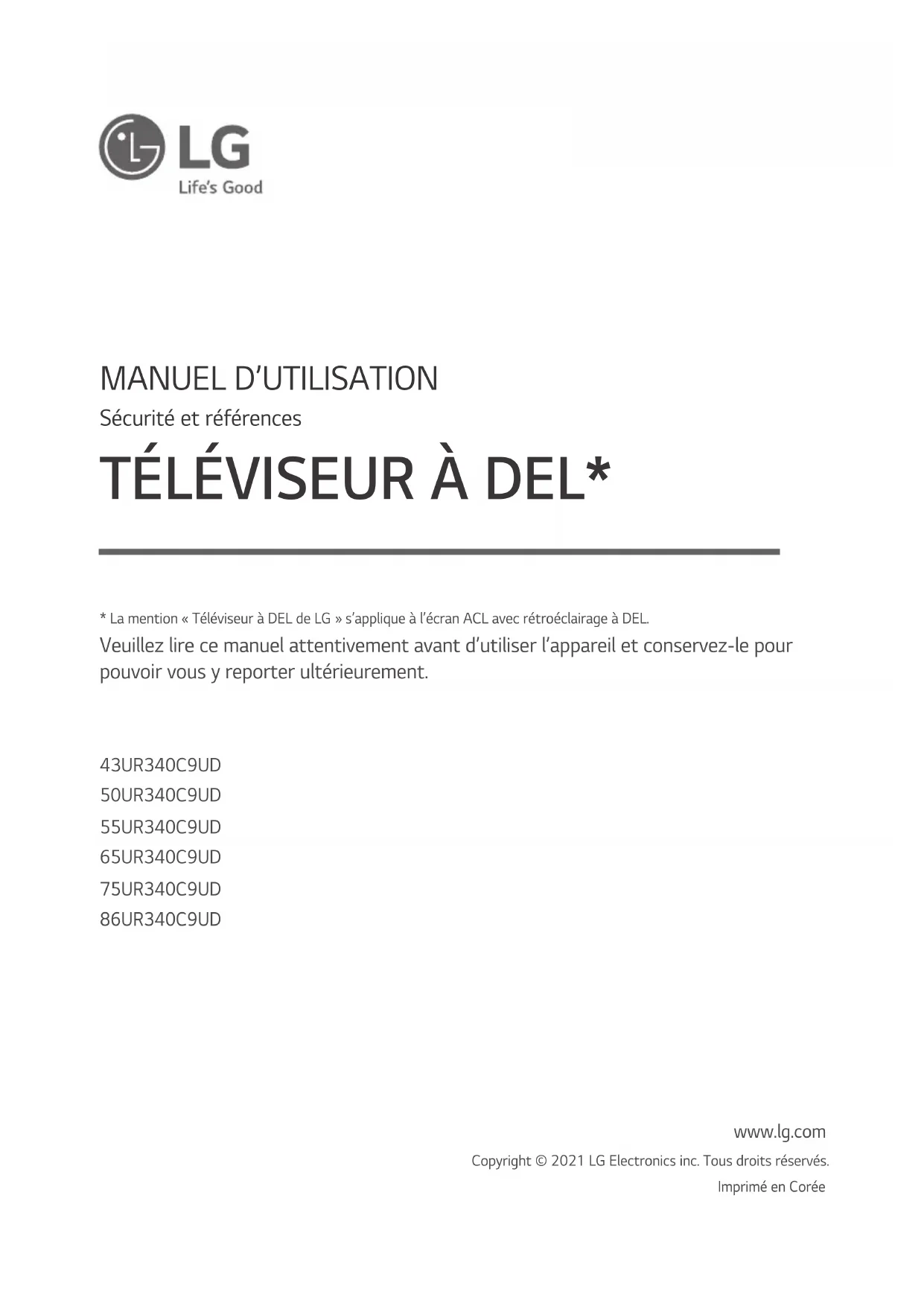 43UR340C9UD 50UR340C9UD 55UR340C9UD 65UR340C9UD 75UR340C9UD 86UR340C9UD www.lg.com Copyright © 2021 LG Electronics inc. Tous droits réservés.Imprimé en Corée* La mention « Téléviseur à DEL de LG » s’applique à l’écran ACL avec rétroéclairage à DEL. Veuillez lire ce manuel attentivement avant d’utiliser l’appareil et conservez-le pour pouvoir vous y reporter ultérieurement.2 FRANÇAIS