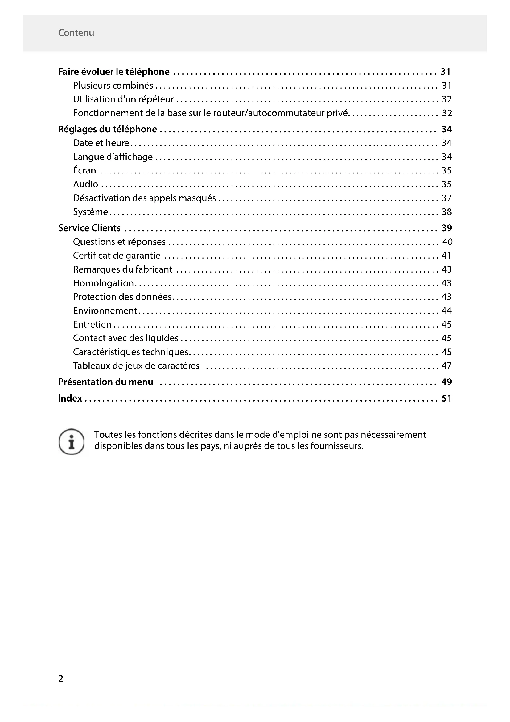 Certificat de garantie . . . . . . . . . . . . . . . . . . . . . . . . . . . . . . . . . . . . . . . . . . . . . . . . . . . . . . . . . . . . . . . . . . 41 Remarques du fabricant . . . . . . . . . . . . . . . . . . . . . . . . . . . . . . . . . . . . . . . . . . . . . . . . . . . . . . . . . . . . . . . 43 Homologation. . . . . . . . . . . . . . . . . . . . . . . . . . . . . . . . . . . . . . . . . . . . . . . . . . . . . . . . . . . . . . . . . . . . . . . . . 43 Protection des données. . . . . . . . . . . . . . . . . . . . . . . . . . . . . . . . . . . . . . . . . . . . . . . . . . . . . . . . . . . . . . . . 43 Environnement . . . . . . . . . . . . . . . . . . . . . . . . . . . . . . . . . . . . . . . . . . . . . . . . . . . . . . . . . . . . . . . . . . . . . . . . 44 Entretien . . . . . . . . . . . . . . . . . . . . . . . . . . . . . . . . . . . . . . . . . . . . . . . . . . . . . . . . . . . . . . . . . . . . . . . . . . . . . . 45 Contact avec des liquides . . . . . . . . . . . . . . . . . . . . . . . . . . . . . . . . . . . . . . . . . . . . . . . . . . . . . . . . . . . . . . 45 Caractéristiques techniques. . . . . . . . . . . . . . . . . . . . . . . . . . . . . . . . . . . . . . . . . . . . . . . . . . . . . . . . . . . . 45 Tableaux de jeux de caractères . . . . . . . . . . . . . . . . . . . . . . . . . . . . . . . . . . . . . . . . . . . . . . . . . . . . . . . . 47 Présentation du menu . . . . . . . . . . . . . . . . . . . . . . . . . . . . . . . . . . . . . . . . . . . . . . . . . . . . . . . . . . . . . . .