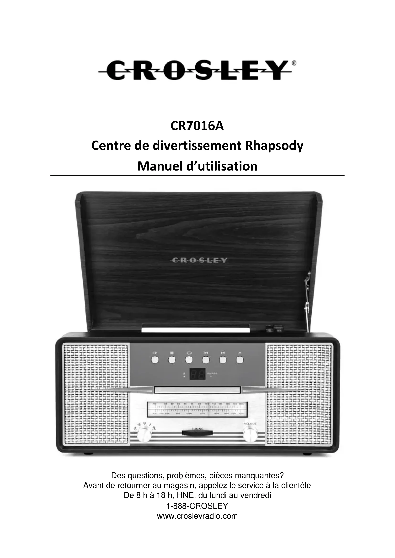 Des questions, problèmes, pièces manquantes? Avant de retourner au magasin, appelez le service à la clientèle De 8 h à 18 h, HNE, du lundi au vendredi 1-888-CROSLEY www.crosleyradio.comFrançais