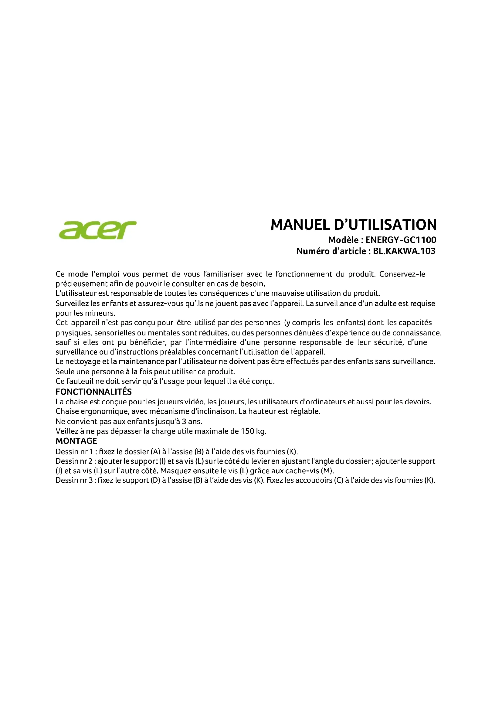 The Acer trademarks are licensed to Asia Kingston (HK) Ltd by Acer Incorporated, a Taiwan R.O.C. company.MANUEL D’UTILISATION Modèle : ENERGY-GC1100 Numéro d’article : BL.KAKWA.103 Ce mode l’emploi vous permet de vous familiariser avec le fonctionnement du produit. Conservez-le précieusement afin de pouvoir le consulter en cas de besoin. L'utilisateur est responsable de toutes les conséquences d'une mauvaise utilisation du produit. Surveillez les enfants et assurez-vous qu’ils ne jouent pas avec l’appareil. La surveillance d'un adulte est requise pour les mineurs. Cet appareil n’est pas conçu pour être utilisé par des personnes (y compris les enfants) dont les capacités physiques, sensorielles ou mentales sont réduites, ou des personnes dénuées d’expérience ou de connaissance, sauf si elles ont pu bénéficier, par l’intermédiaire d’une personne responsable de leur sécurité, d’une surveillance ou d’instructions préalables concernant l’utilisation de l’appareil. Le nettoyage et la maintenance par l'utilisateur ne doivent pas être effectués par des enfants sans surveillance. Seule une personne à la fois peut utiliser ce produit. Ce fauteuil ne doit servir qu’à l’usage pour lequel il a été conçu. FONCTIONNALITÉS La chaise est conçue pour les joueurs vidéo, les joueurs, les utilisateurs d'ordinateurs et aussi pour les devoirs. Chaise ergonomique, avec mécanisme d'inclinaison. La hauteur est réglable. Ne convient pas aux enfants jusqu'à 3 ans. Veillez à ne pas dépasser la charge utile maximale de 150 kg. MONTAGE Dessin nr 1 : fixez le dossier (A) à l’assise (B) à l’aide des vis fournies (K). Dessin nr 2 : ajouter le support (I) et sa vis (L) sur le côté du levier en ajustant l'angle du dossier ; ajouter le support (J) et sa vis (L) sur l’autre côté. Masquez ensuite le vis (L) grâce aux cache-vis (M). Dessin nr 3 : fixez le support (D) à l’assise (B) à l’aide des vis (K). Fixez les accoudoirs (C) à l’aide des vis fournies (K).Dessin nr 4 : fixez les roulettes (H) à chacune des cinq branches du pied (G). Placez le cylindre pneumatique (E) dans le pied cinq branches (G) et le cache du cylindre (F) sur le cylindre pneumatique. Dessin nr 5 : placez les coussins (P et Q) et placez la partie supérieure du siège (assise et dossier) sur la structure du pied. Dessin nr 6 : votre siège est désormais assemblé et prêt à l’emploi. Dessin nr 7 : connectez les deux câbles au dos de la chaise pour alimenter le système d’éclairage. Dessin nr 8 : connectez le câble USB à une banque d’alimentation (non incluse) et placez-le dans la poche sous le siège. Les lumières s’allumeront. Utilisez la télécommande pour les régler. ENTRETIEN Placez le fauteuil sur une surface stable, plane et propre. Utilisez un tissu doux pour le nettoyage de la chaise. Nettoyez avec un chiffon imbibé d’un peu d’eau chaude. N’utiliser qu’un détergent liquide doux pour le nettoyage. Séchez avec un chiffon propre. N’utilisez pas de produits de nettoyage agressifs. Évitez une exposition prolongée aux rayons du soleil. N’utilisez pas le fauteuil en plein air. Ne pas utiliser ce fauteuil à moins que toutes les vies et tous les boulons soient resserrés. Conservez le produit dans son emballage ou couvrez-le pour éviter la poussière lorsqu'il n'est pas utilisé.