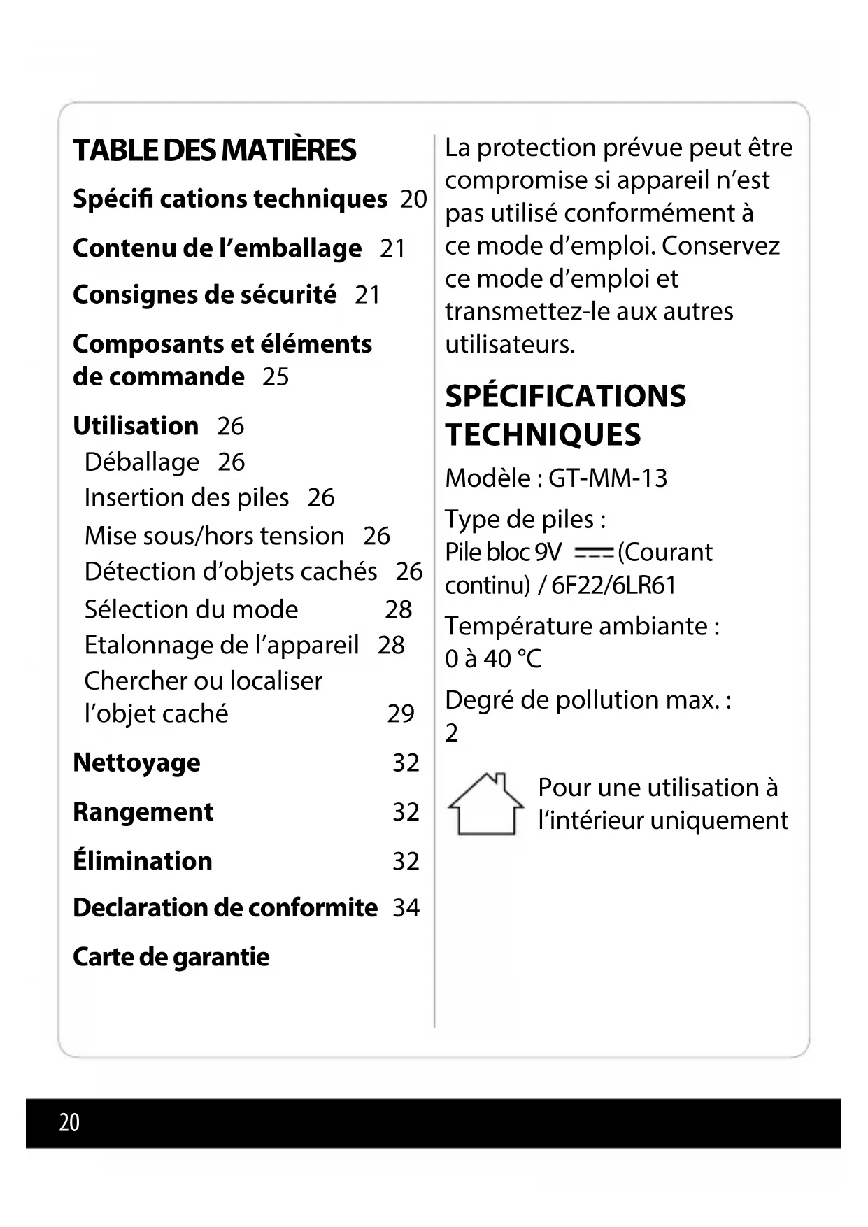 Spéci cations techniques 20 Contenu de l’emballage 21 Consignes de sécurité 21 Composants et éléments de commande 25 Utilisation 26 Déballage 26 Insertion des piles 26 Mise sous/hors tension 26 Détection d’objets cachés 26 Sélection du mode 28 Etalonnage de l’appareil 28 Chercher ou localiser l’objet caché 29 Nettoyage 32 Rangement 32 Élimination 32 Declaration de conformite 34 Carte de garantie21 Nous faisons en permanence des e orts pour perfectionner et améliorer nos produits, et de ce fait, des modi cations techniques ou du design ne sont pas exclues. Cette notice d’utilisation peut être téléchargée en format PDF de notre site Internet www.gt-support.de CONTENU DE L’ EM B AL L AG E Appareil de détection Pile bloc 9 V / 6F22/6LR61 Notice d’utilisation avec carte de garantie CONSIGNES DE SÉCURITÉ Lisez attentivement les informations suivantes et conservez cette notice d’utilisation a n de pouvoir relire plus tard encore. Joignez cette notice quand vous transmettez l’appareil à une autre personne. Mise en garde ! Veuillez observer les mesures de sécurité essentielles y compris les consignes suivantes relatives à la sécurité contre les incendies lors de l’utilisation des appareils actionnés par piles a n d’écarter le risque de dommages personnels et matériels. Maintenez votre zone de travail en ordre !