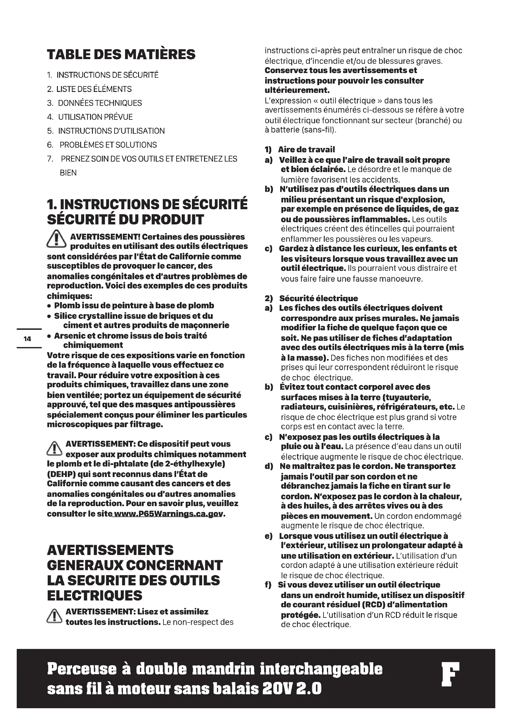 AVERTISSEMENT! Certaines des poussières produites en utilisant des outils électriques sont considérées par l’État de Californie comme susceptibles de provoquer le cancer, des anomalies congénitales et d’autres problèmes de reproduction. Voici des exemples de ces produits chimiques: