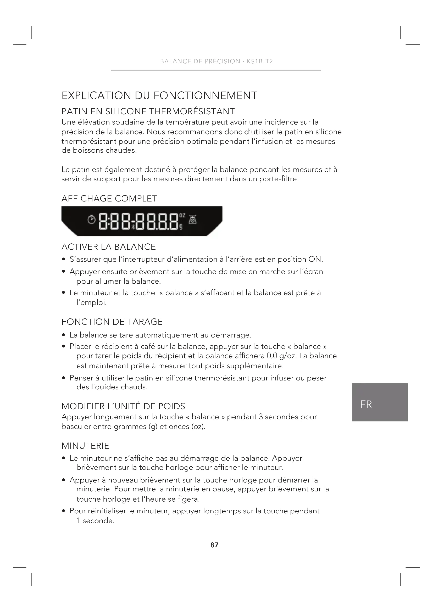 Une élévation soudaine de la température peut avoir une incidence sur la précision de la balance. Nous recommandons donc d’utiliser le patin en silicone thermorésistant pour une précision optimale pendant l’infusion et les mesures de boissons chaudes. Le patin est également destiné à protéger la balance pendant les mesures et à servir de support pour les mesures directement dans un porte-ltre. AFFICHAGE COMPLET
