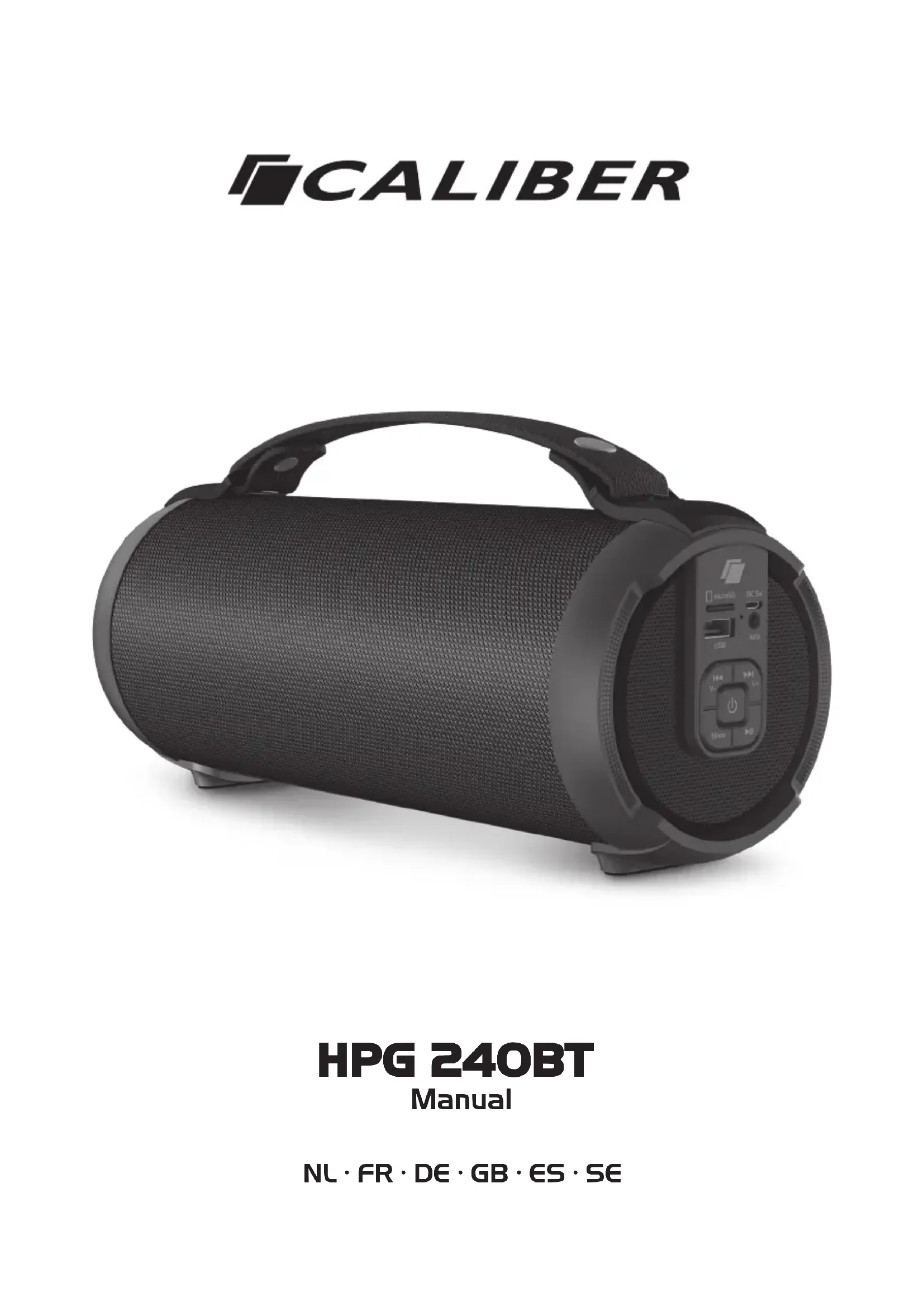 - In de TWS-modus, als u uw mobiele telefoon met het apparaat (dat u aan het begin hebt ingesteld) hebt verbonden via de meegeleverde audiokabel, zal het apparaat AUX beginnen af te spelen via de TWS-functie, onder deze status kunt u niet overschakelen naar de Bluetooth-modus door op de knop Modus te drukken.MANUEL Précautions Consignes à respecter pour une utilisation en toute sécurité Lisez le présent manuel attentivement avant d’utiliser ce produit est ses composants. Il contient des instructions relatives à l’utilisation de ce produit en toute sécurité et ecacité. Caliber Europe BV n’assume aucune responsabilité pour tout problème résultant du non-respect des consignes contenues dans le présent manuel. Mettez l’appareil hors tension immédiatement en cas de problème. Le non-respect de cette consigne peut entraîner des blessures corporelles ou endommager le produit. Retournez-le à votre revendeur agréé Caliber Europe BV pour réparation. Nettoyage du produit. Utilisez un chion doux et sec pour nettoyer le produit périodiquement. Pour traiter les taches les plus tenaces, veuillez humidier le chion avec de l’eau uniquement. Tout autre produit risque de dissoudre la peinture ou d’endommager le plastique. Température. Assurez-vous que la température ambiante est comprise entre 0°C et +45°C avant de mettre l’appareil. Entretien. En cas de problèmes, ne tentez pas de réparer l’appareil par vous-même. Retournez-le à votre revendeur agréé Caliber Europe BV pour l’entretien. Disposition. Posez le produit sur une surface plane. Prévoyez un espace susant autour du produit pour assurer une aération susante. Chaleur. Ne disposez pas l’appareil à proximité d’une source de chaleur ou exposé aux rayons solaires. Tension. Assurez-vous que la tension secteur indiquée sur la plaque signalétique de l’adaptateur/du produit est conforme à la fourniture d’électricité au niveau local. Si tel n’est pas le cas, retournez le produit au magasin où vous l’avez acheté. Fiche. Retirez la che de la prise de courant lorsque vous ne pensez pas utiliser le produit pendant une longue période et pendant les orages. Accessoires. Utilisez exclusivement les accessoires fournis Remplacement de la pile. La pile rechargeable intégrée n’est pas remplaçable. Ne retirez pas et ne remplacez pas la pile ; ne la jetez pas dans la poubelle ou ne l’incinérez pas. Utilisez exclusivement l’adaptateur de charge fourni. FRANÇAIS Ci-dessous les descriptions des caractéristiques/options du HPG 240BT, ci-après appelé «appareil».. Les chires entre les «(...)» font référence à la clé ou aux connexions sur l’appareil. Les illustrations se trouvent au début de ce manuel. Mise en marche/arrêt Appuyez longuement sur le bouton d’alimentation (9) pour mettre en marche Pression brève pour éteindre Charge des batteries L’appareil dispose d’une batterie rechargeable intégrée. L’appareil est fourni avec un câble d’alimentation USB. Utilisez un adaptateur USB et connectez l’adaptateur à l’entrée DC de l’appareil (6). Pendant la charge, le témoin lumineux (5) s’allume en rouge et s’éteint lorsque la batterie est entièrement chargée. Le temps de charge est de 2-4 heures avec un adaptateur 5V 2A. L’appareil fonctionnera sans le câble de chargement en utilisant la batterie interne. La décharge de la batterie dépend de l’utilisation qui en est faite. E.G : Une musique lourde, forte et basse utilisera plus l’énergie à produire que la parole. Connexion Bluetooth