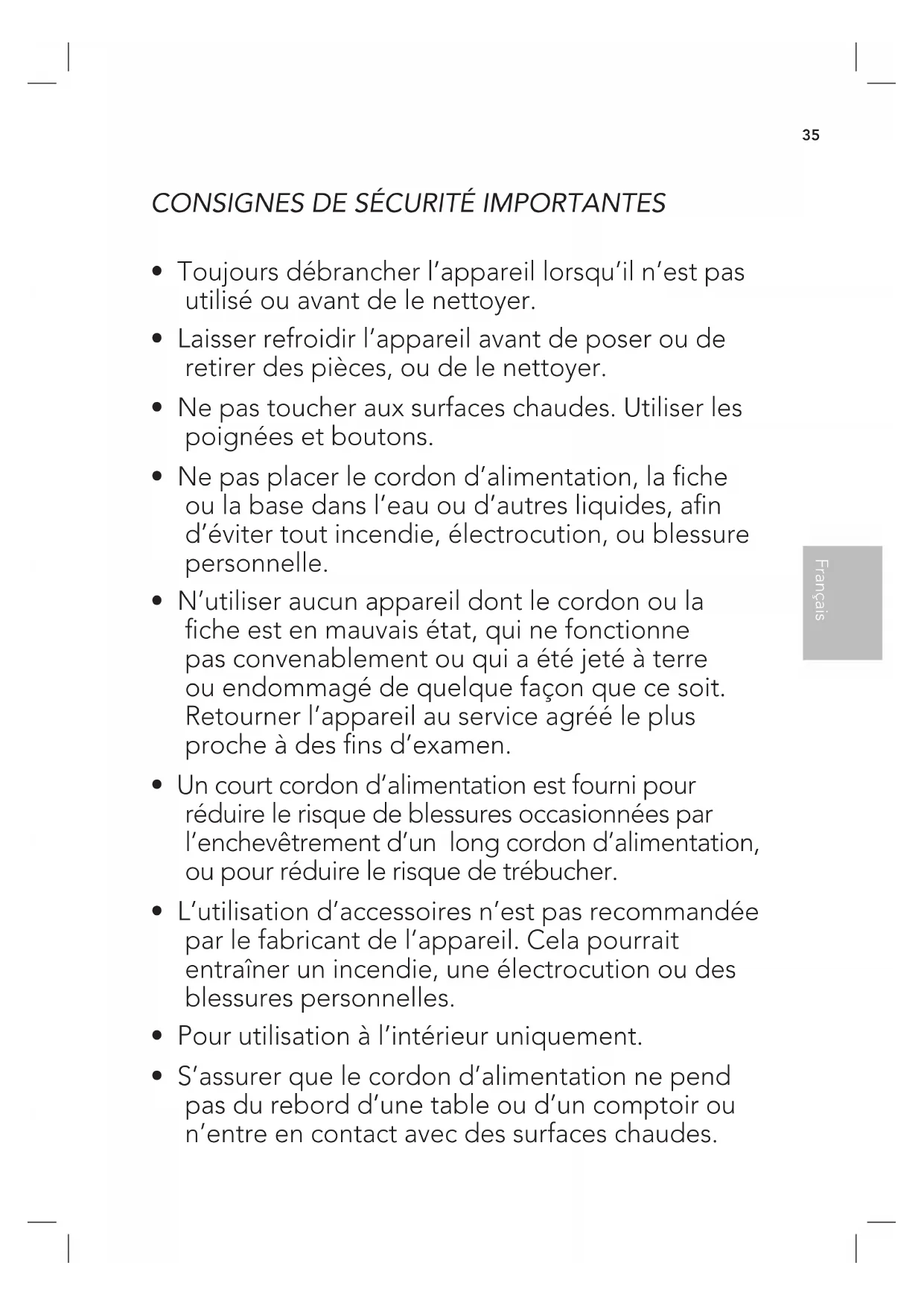 - N’utiliser aucun appareil dont le cordon ou la fiche est en mauvais état, qui ne fonctionne pas convenablement ou qui a été jeté à terre ou endommagé de quelque façon que ce soit. Retourner l’appareil au service agréé le plus proche à des fins d’examen.
