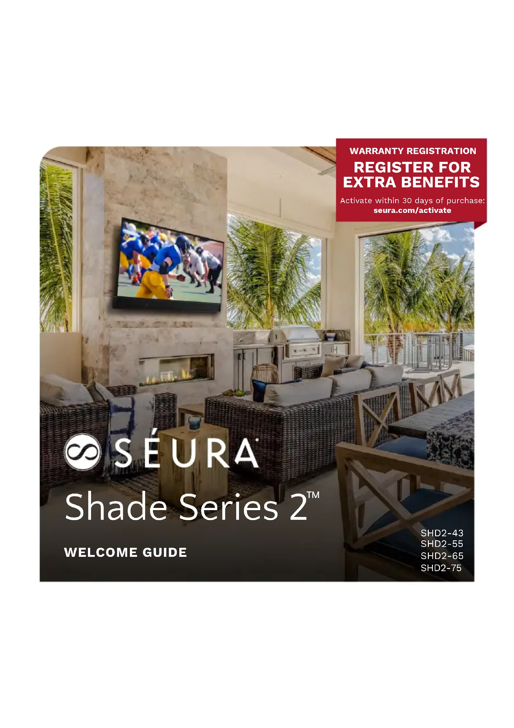 recommended usage, serious injury or death to user may result. AVERTISSEMENTS Pour réduire le risque d’incendie, de choc électrique et d’autres blessures, garder ces consignes de sécurité à l’esprit lors de l’installation, l’utilisation et l’entretien de votre moniteur en plein air. La prise de courant doit être installée près de l’équipement et être facilement accessible. Le moniteur doit être relié à une prise de courant avec terre protégé par disjoncteur différentiel. ATTENTION: Si vous manipulez contre l’utilisation recommandée, des blessures graves ou la mort à l’utilisateur peuvent en résulter. FCC Supplier’s Declaration of Conformity Séura Outdoor Entertainment SHD2-43, SHD2-55, SHD2-65, SHD2-75 This device complies with part 15 of the FCC Rules. Operation is subject to the follow two conditions: (1) This device may not cause harmful interference, and (2) this device must accept any interference received, including interference that may cause undesired operation. PAN International Address: 48008 Fremont Blvd, Fremont, CA 94538 United States Phone number: 510-623-3810 This equipment complies with FCC radiation exposure limits set forth for an uncontrolled environment. This equipment should be installed and operated with a minimum distance of 20 cm between the radiator and any part of your body.