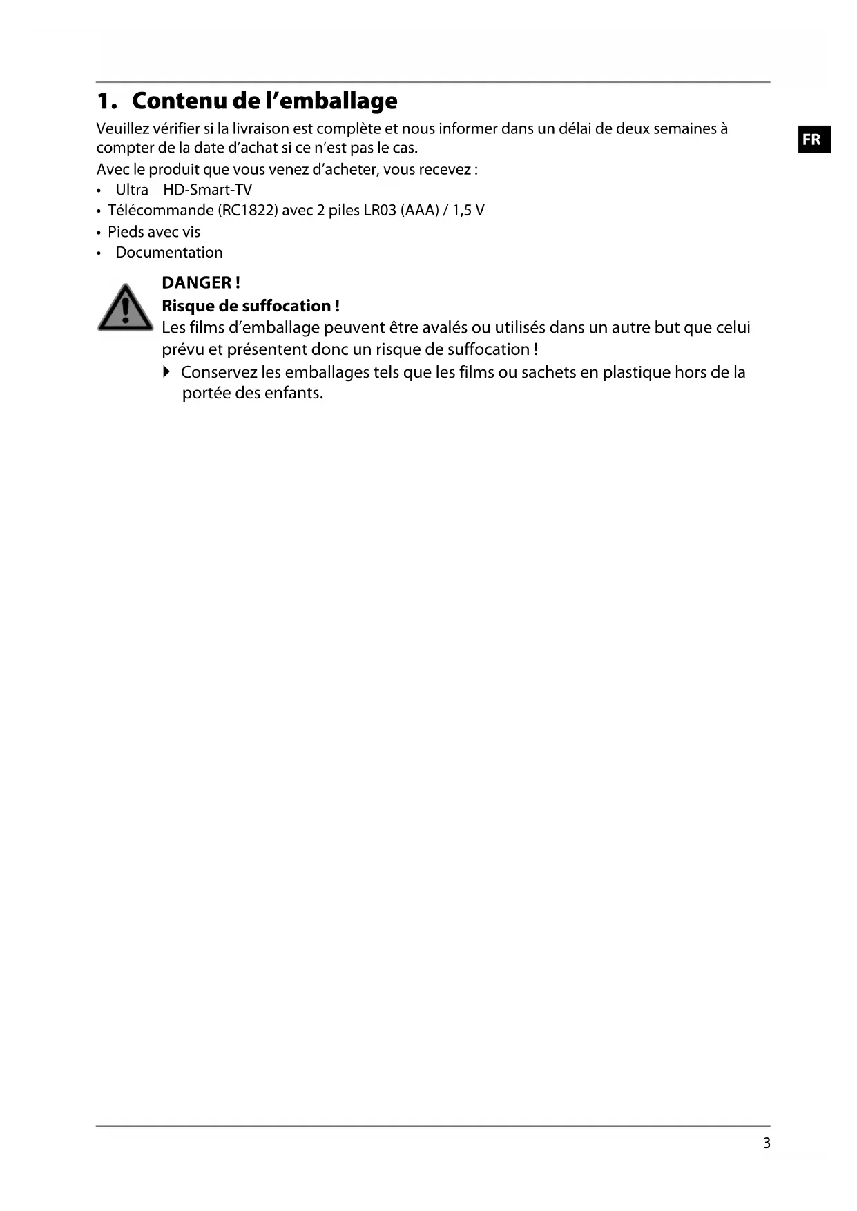 Avant de mettre l‘appareil en marche, lisez impérativement les « Consignes de sécurité ». 3.1. Déballage Avant le déballage, choisissez un endroit adapté pour l’installation de l’appareil. Ouvrez le carton avec précaution pour éviter d’endommager l’appareil, par exemple avec un couteau à longue lame. L’emballage contient différentes petites pièces (piles, etc.). Conservez-les hors de la portée des enfants : ils pourraient s’étouffer ! Conservez soigneusement les emballages et utilisez uniquement ceux-ci pour transporter le té- léviseur. DANGER ! Risque de suffocation ! Les films d’emballage peuvent être avalés ou utilisés dans un autre but que celui prévu et présentent donc un risque de suffocation ! Conservez les emballages tels que les films ou sachets en plastique hors de la portée des enfants.FR