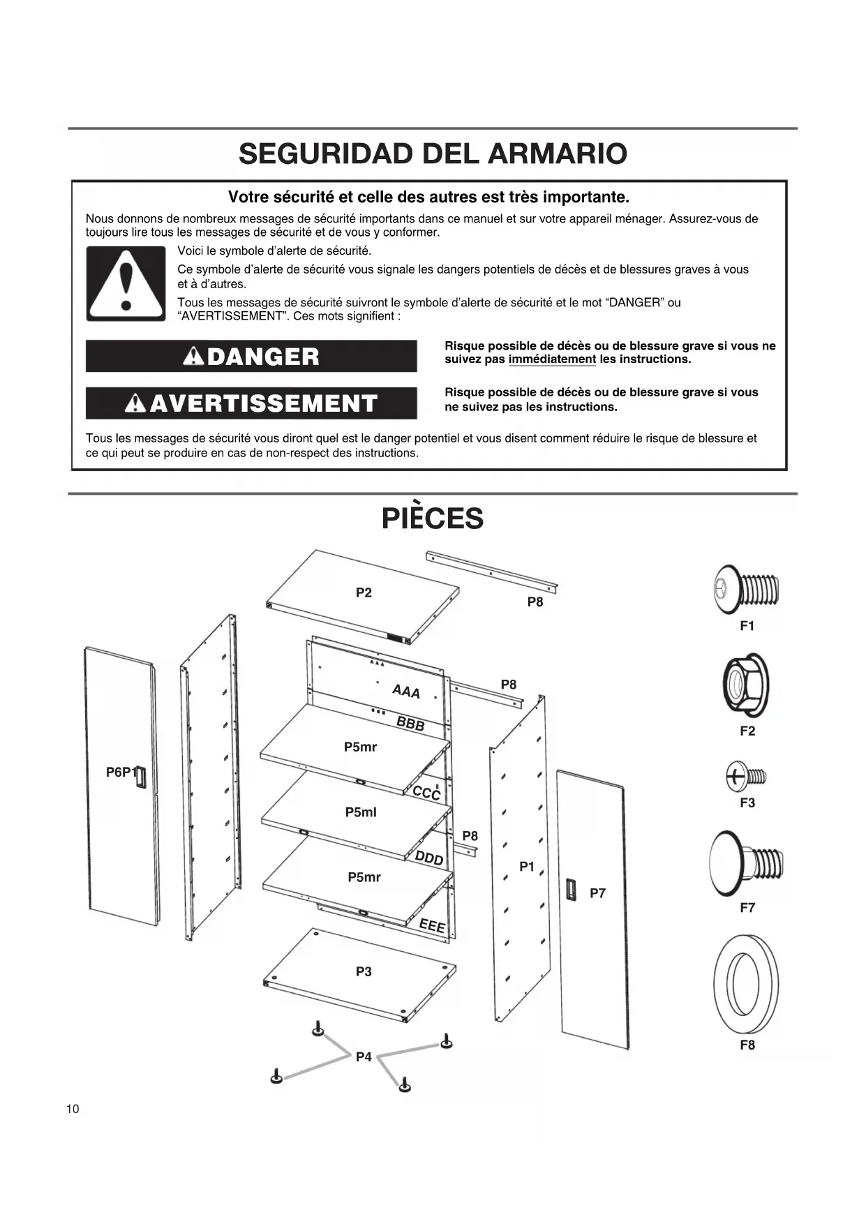 DDD EEE CCC PIÈCES11 INSTRUCTIONS D'ASSEMBLAGE Outils et pièces Rassembler les outils nécessaires avant de commencer l'installation.Outillage nécessaire : ■ Clé de 1/2" ■ Niveau ■ Tournevis PhillipsOutils fournis : ■ Clé hexagonale ■ Clé de serrure Spécications d'utilisation de l'armoire ■ Le produit est conçu pour l'utilisation dans un garage. ■ Charge maximale de 50 lb (22,7 kg) par étagère. ■ Charge maximale de 300 lb (136 kg) pour l'armoire. Déballage des pièces de l'armoire 1. Retirer le contenu; vérier la présence de toutes les pièces. Le contenu inclut une clé hexagonale, une clé de serrure, ainsi que toutes les pièces et attaches illustrées dans la section “Pièces”.2. Jeter/recycler tous les matériaux d'emballage. Assemblage de l'armoire AVERTISSEMENT Risque du poids excessifUtiliser deux ou plus de personnes pour déplacer, assembler, ou installer l’armoire.Le non-respect de cette instruction peut causer une blessure au dos ou d'autre blessure.IMPORTANT : La participation de deux personnes peut être nécessaire pour l'assemblage. Lors de l'assemblage de l'armoire, placer vers le haut les rives comportant les trous. Si l’assemblage de l’armoire est effectué sur le sol, serrer les huit boulons des angles avant (deux dans chaque angle) après avoir redressé l’armoire verticalement.