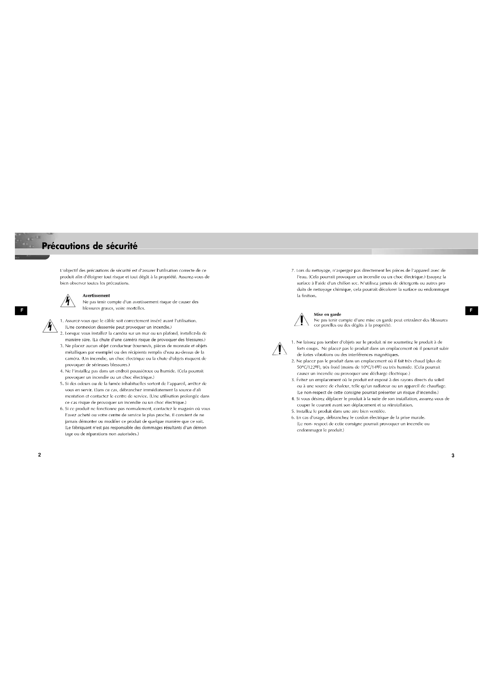 Précautions de sécurité F F L’objectif des précautions de sécurité est d’assurer l’utilisation correcte de ce produit afin d’éloigner tout risque et tout dégât à la propriété. Assurez-vous de bien observer toutes les précautions. Avertissement Ne pas tenir compte d’un avertissement risque de causer des blessures graves, voire mortelles.