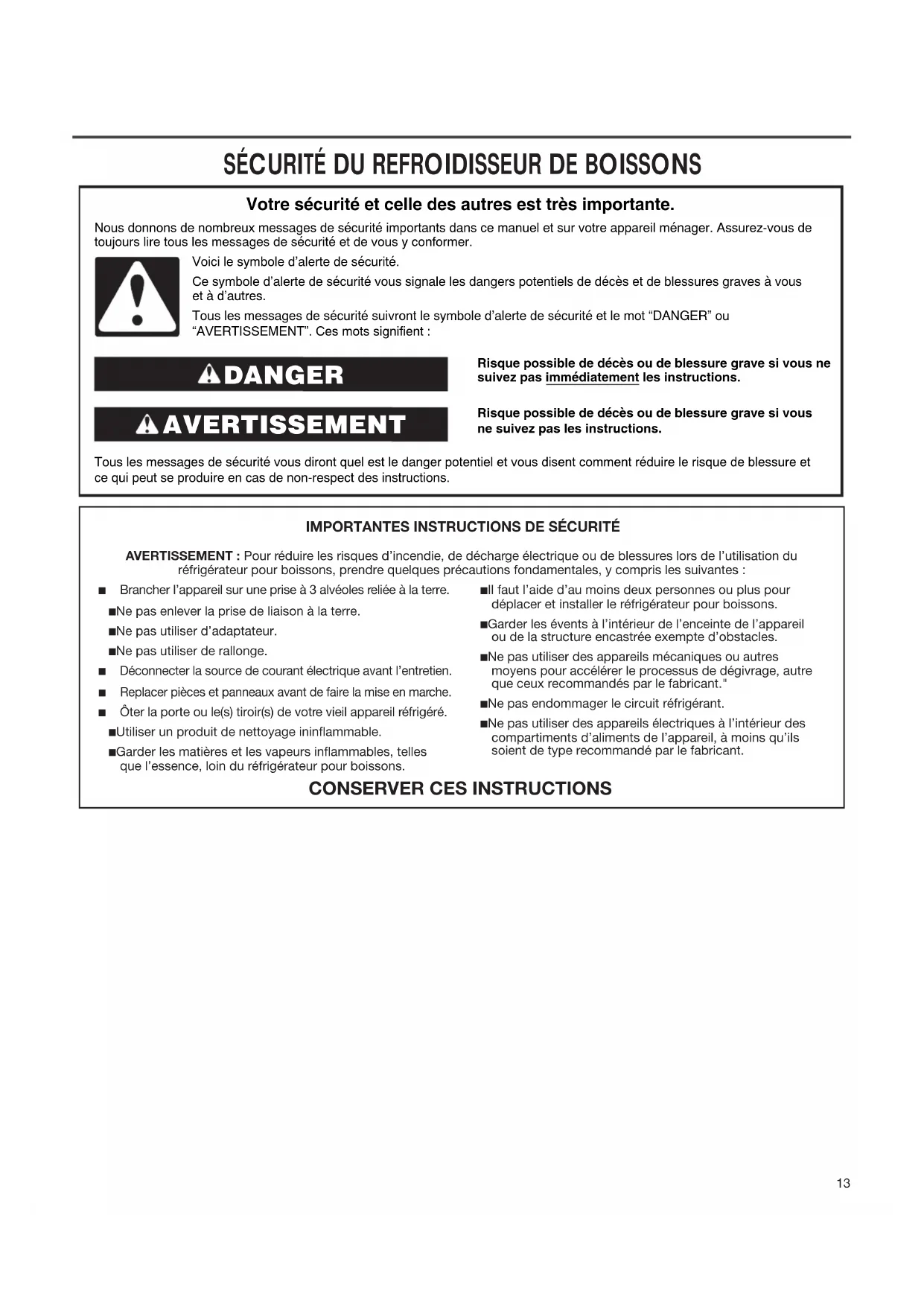 réfrigérateur pour boissons, prendre quelques précautions fondamentales, y compris les suivantes: ■ Brancher l’appareil sur une prise à 3 alvéoles reliée à la terre. ■ Ne pas enlever la prise de liaison à la terre. ■ Ne pas utiliser d’adaptateur. ■ Ne pas utiliser de rallonge. ■ Déconnecter la source de courant électrique avant l’entretien. ■ Replacer pièces et panneaux avant de faire la mise en marche. ■ Ôter la porte ou le(s) tiroir(s) de votre vieil appareil réfrigéré. ■ Utiliser un produit de nettoyage ininammable. ■ Garder les matières et les vapeurs inammables, telles que l’essence, loin du réfrigérateur pour boissons. ■ Il faut l’aide d’au moins deux personnes ou plus pour déplacer et installer le réfrigérateur pour boissons. ■ Garder les évents à l’intérieur de l’enceinte de l’appareil ou de la structure encastrée exempte d’obstacles. ■ Ne pas utiliser des appareils mécaniques ou autres moyens pour accélérer le processus de dégivrage, autre que ceux recommandés par le fabricant." ■ Ne pas endommager le circuit réfrigérant. ■ Ne pas utiliser des appareils électriques à l’intérieur des compartiments d’aliments de l’appareil, à moins qu’ils soient de type recommandé par le fabricant.