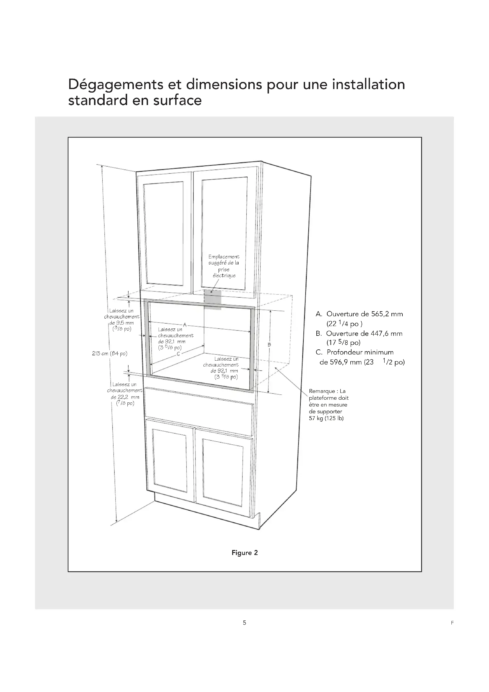 /2 po) Remarque : La plateforme doit être en mesure de supporter 57 kg (125 lb)Emplacement suggéré de la prise électriqueLaissez un chevauchement de 92,1 mm