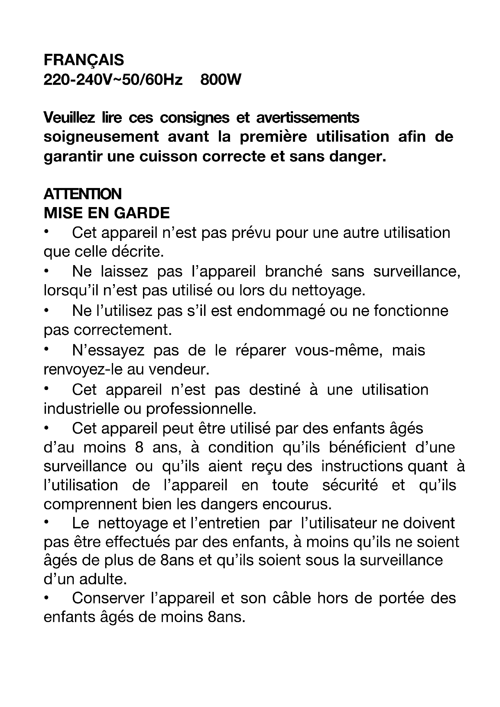 Veuillez lire ces consignes et avertissements soigneusement avant la première utilisation afin de garantir une cuisson correcte et sans danger.