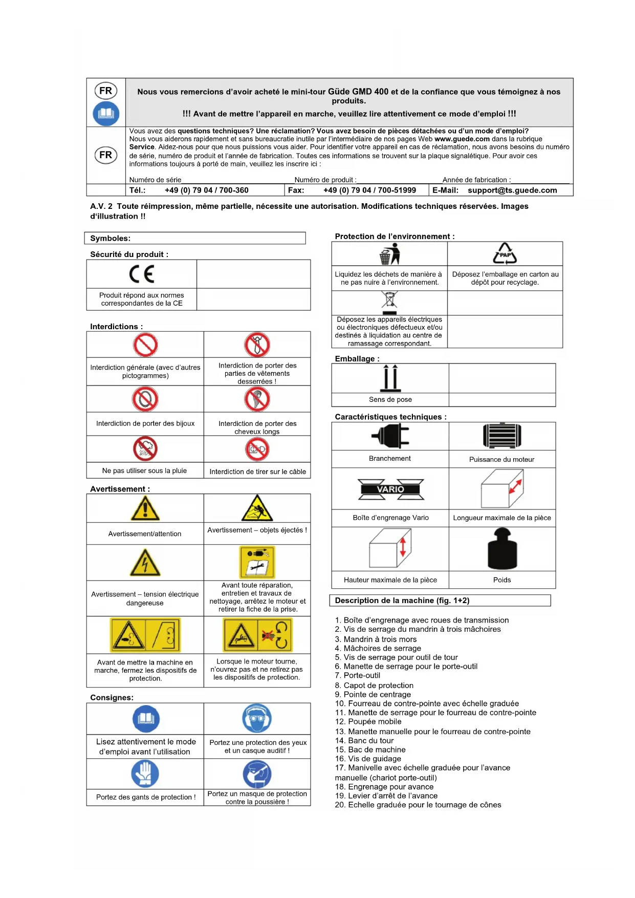 Nous vous remercions d’avoir acheté le mini-tour Güde GMD 400 et de la confiance que vous témoignez à nos produits. !!! Avant de mettre l’appareil en marche, veuillez lire attentivement ce mode d’emploi !!!