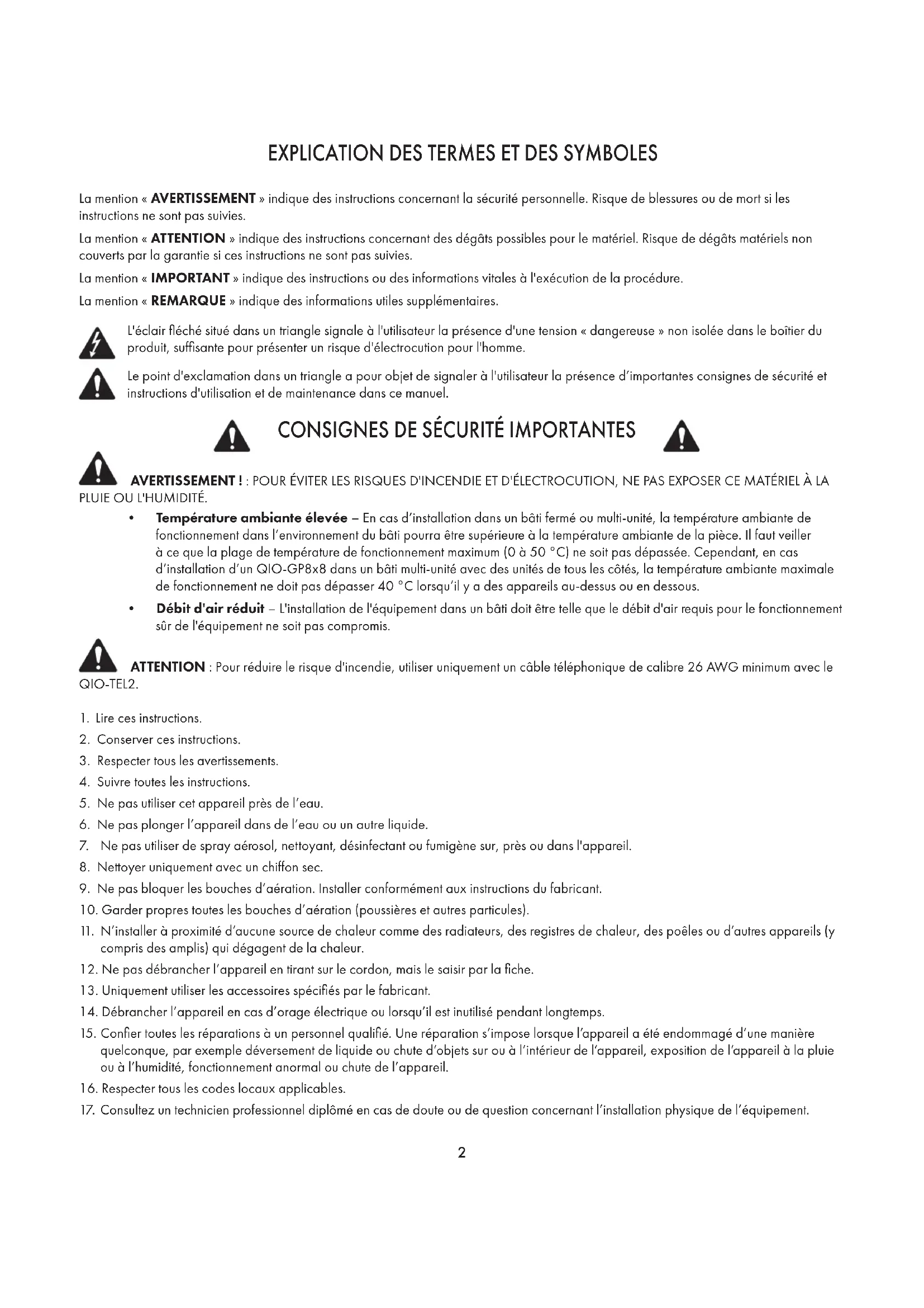 - Débit d'air réduit – L'installation de l'équipement dans un bâti doit être telle que le débit d'air requis pour le fonctionnement sûr de l'équipement ne soit pas compromis. ATTENTION: Pour réduire le risque d'incendie, utiliser uniquement un câble téléphonique de calibre 26 AWG minimum avec le QIO-TEL2.