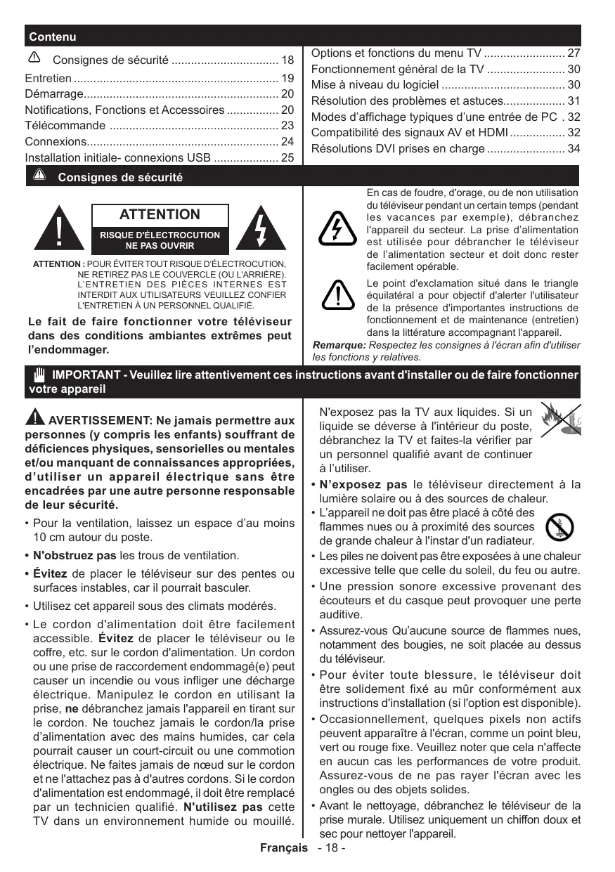L'ENTRETIEN À UN PERSONNEL QUALIFIÉ. Le fait de faire fonctionner votre téléviseur dans des conditions ambiantes extrêmes peut l’endommager. En cas de foudre, d'orage, ou de non utilisation du téléviseur pendant un certain temps (pendant les vacances par exemple), débranchez l'appareil du secteur. La prise d’alimentation est utilisée pour débrancher le téléviseur de l’alimentation secteur et doit donc rester facilement opérable. Le point d'exclamation situé dans le triangle équilatéral a pour objectif d'alerter l'utilisateur de la présence d'importantes instructions de fonctionnement et de maintenance (entretien) dans la littérature accompagnant l'appareil. Remarque: Respectez les consignes à l'écran afin d'utiliser les fonctions y relatives. IMPORTANT - Veuillez lire attentivement ces instructions avant d'installer ou de faire fonctionner votre appareil N'exposez pas la TV aux liquides. Si un liquide se déverse à l'intérieur du poste, débranchez la TV et faites-la vérifier par un personnel qualifié avant de continuer à l’utiliser.