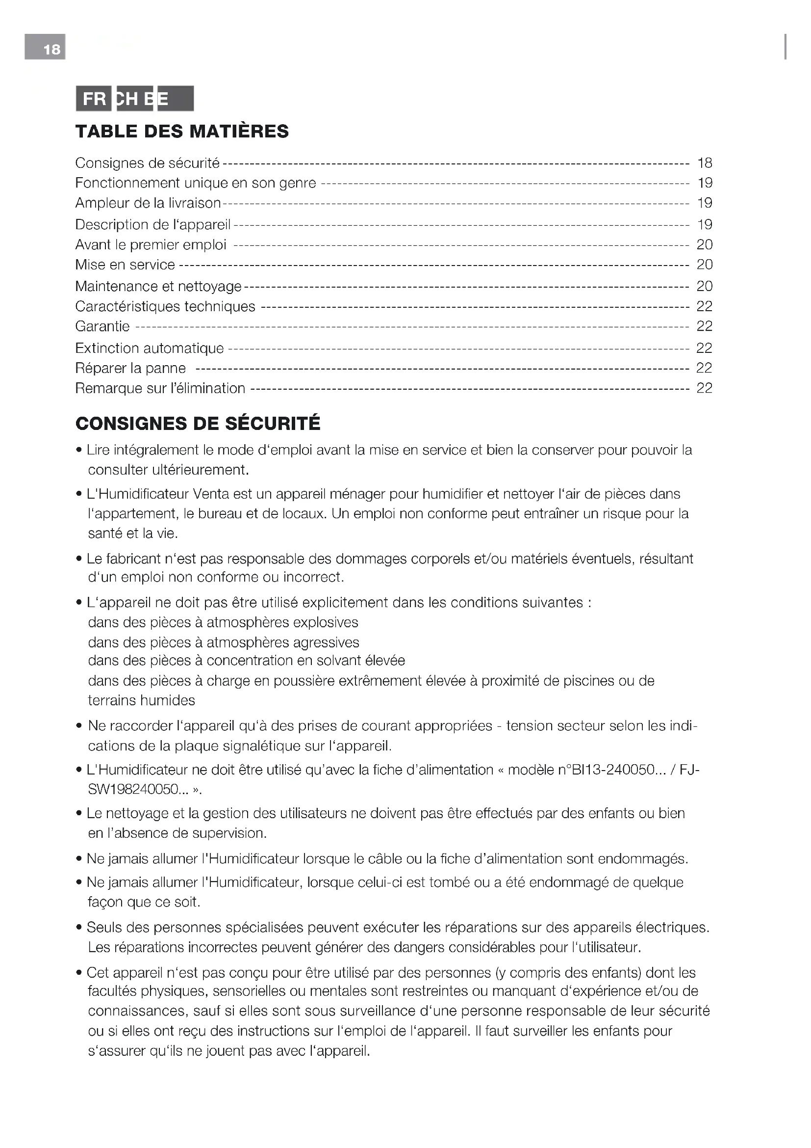 - Retirez la che d’alimentation de la prise de courant, lorsque vous n’utilisez pas l’appareil. CHER CLIENT, Le système Venta de lavage d’air propose une technique unique au monde. L'Humidicateur Venta fonctionne sans éléments ltrants et est donc extrêmement hygiénique. FONCTIONNEMENT UNIQUE: L‘air sec et sale est conduit dans l‘appareil. La pile de disques en rotation avec une surface de 4,2m² garantit dans un espace minimal que l‘air sec puisse absorber l‘humidité et que l‘eau pure puisse s‘évaporer. Les particules de saleté jusqu‘à 10µm (10/1000mm) sont retenues dans l‘eau. Il n‘y a pas de ltres qui s‘encrassent à la longue. Le ltre Venta, c‘est l‘eau: tous les jours, fraîche et propre, et année après année avec la même grande performance de purication/humidication.