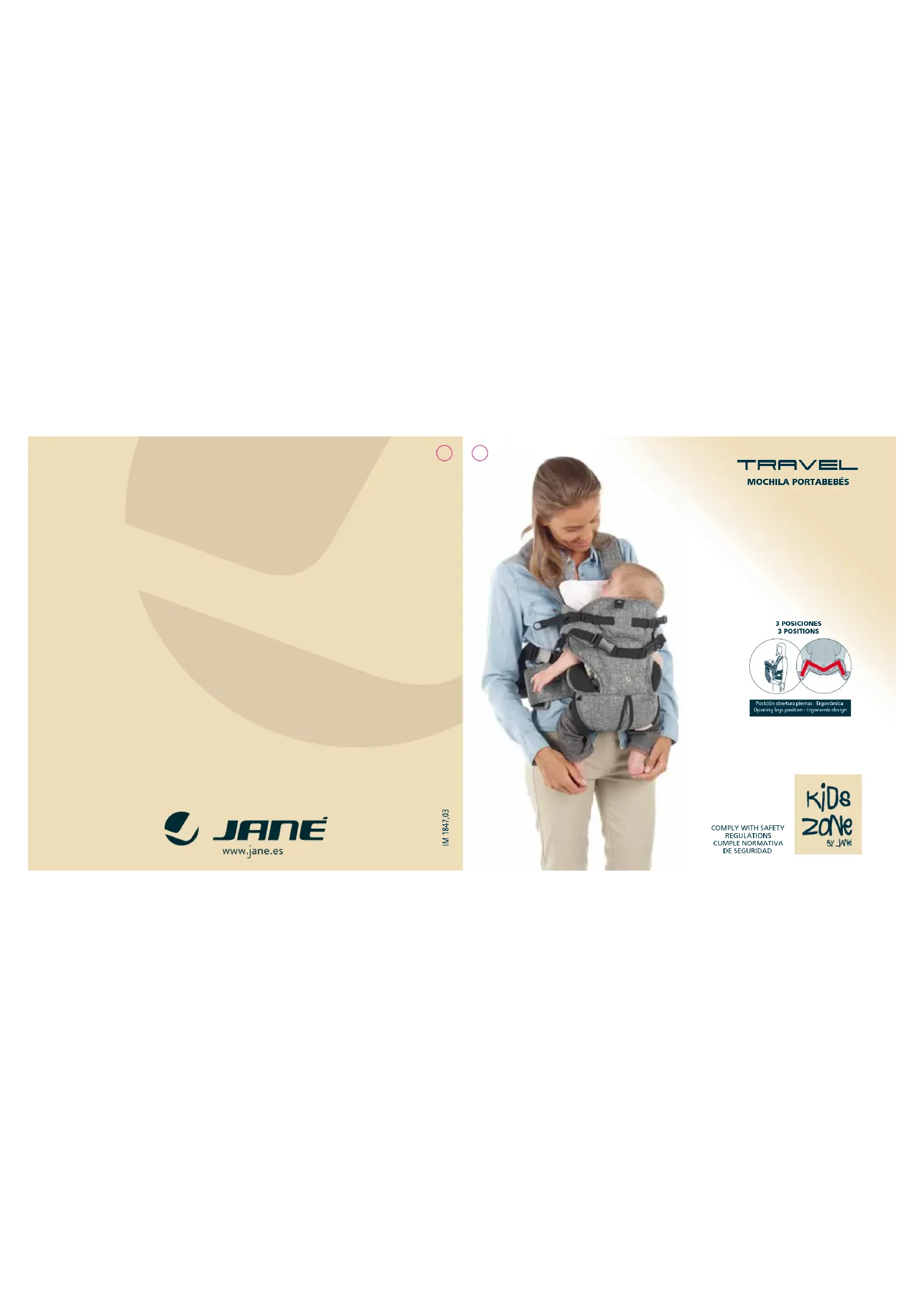 - Le porte-bébé TRAVEL de Jané, répond à la norme de sécurité EN 13209-2: 2015 (Porte-bébés). CONÇU EN ESPAGNE - FABRIQUÉ EN CHINE.