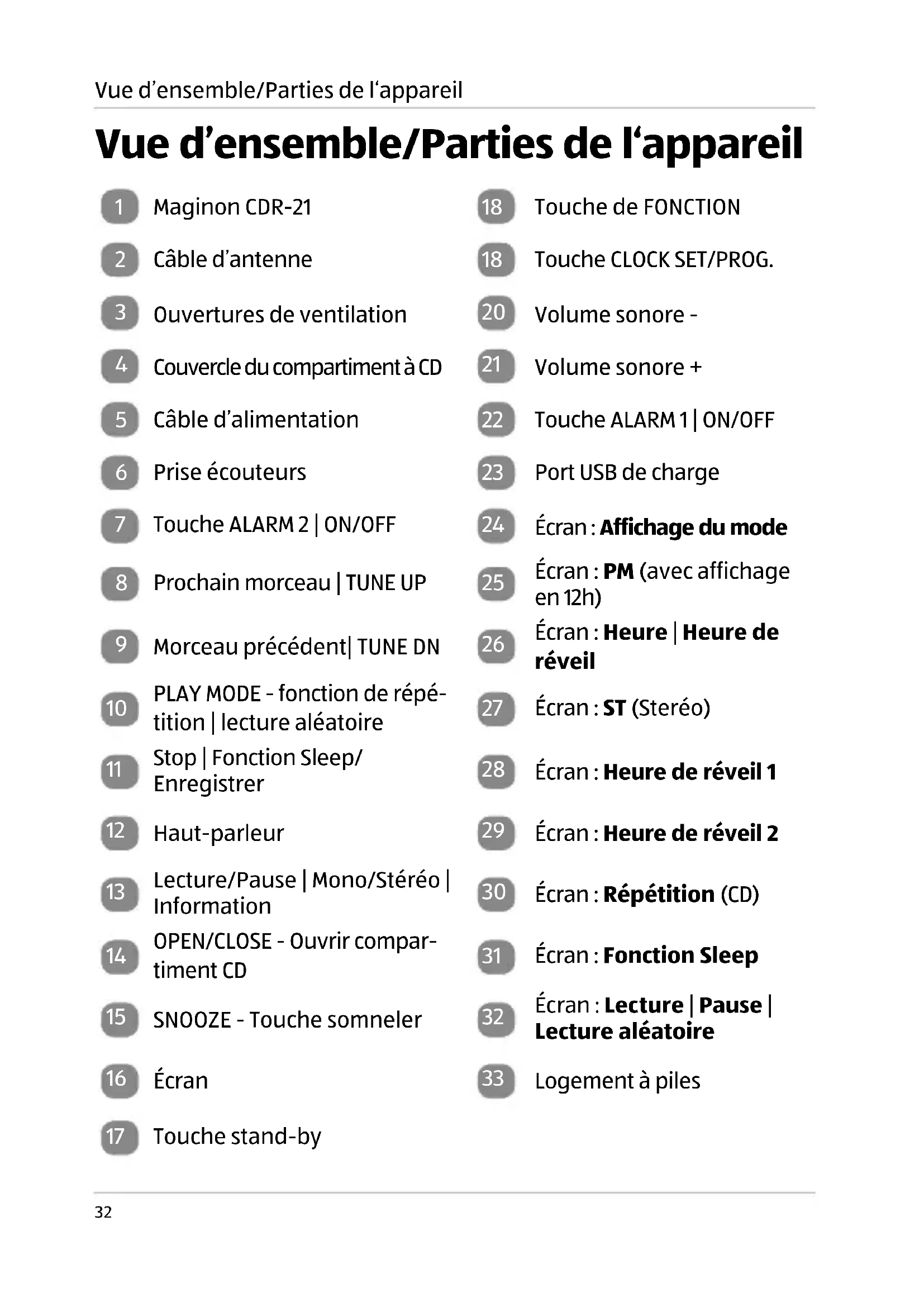 secteur le radio-réveil lecteur de CD en cas de dérangement. − Le radio-réveil lecteur de CD est coupé du secteur uni- quement lorsque le bloc-secteur est débranché de la prise électrique. − Branchez le radio-réveil lecteur de CD uniquement à une prise électrique installée dans les règles de l’art. − En cas de dommages, faites remplacer le câble d’alimenta- tion ou des pièces du radio-réveil lecteur de CD uniquement par le constructeur, son service après-vente ou toute autre personne ayant les mêmes qualifications. Seules les pièces prévues par le constructeurs pourront être utilisées. − N’ouvrez pas le boîtier du radio-réveil lecteur de CD et n’ef- fectuez aucune modification sur le radio-réveil lecteur de CD. En règle générale, faites faire les travaux sur le radio-réveil lecteur de CD uniquement par un électricien professionnel ou par notre service après-vente. − Pour les réparations, seules des pièces correspondant aux données d'origine de l'appareil pourront être utilisées. Ce radio-réveil lecteur de CD contient des pièces électriques et mécaniques qui sont indispensables pour la protection contre les sources de danger. − Pour le fonctionnement du radio-réveil lecteur de CD, utili- sez exclusivement les accessoires livrés ou spécifiés par le constructeur. − Ne plongez ni le radio-réveil lecteur de CD ni le câble d'ali- mentation ou la fiche dans de l'eau ou d'autres liquides. Éloignez le radio-réveil lecteur de CD, le câble d’alimentation et le bloc-secteur de toute humidité. − Protégez le radio-réveil lecteur de CD contre l’eau qui goutte ou suinte et ne posez dessus aucun récipient rempli de liquide, comme p. ex. des vases. − Ne mettez pas le radio-réveil lecteur de CD en marche si du liquide a pénétré dans le boîtier du radio-réveil lecteur de CD. Dans un tel cas, débranchez immédiatement le bloc-secteur.Sécurité