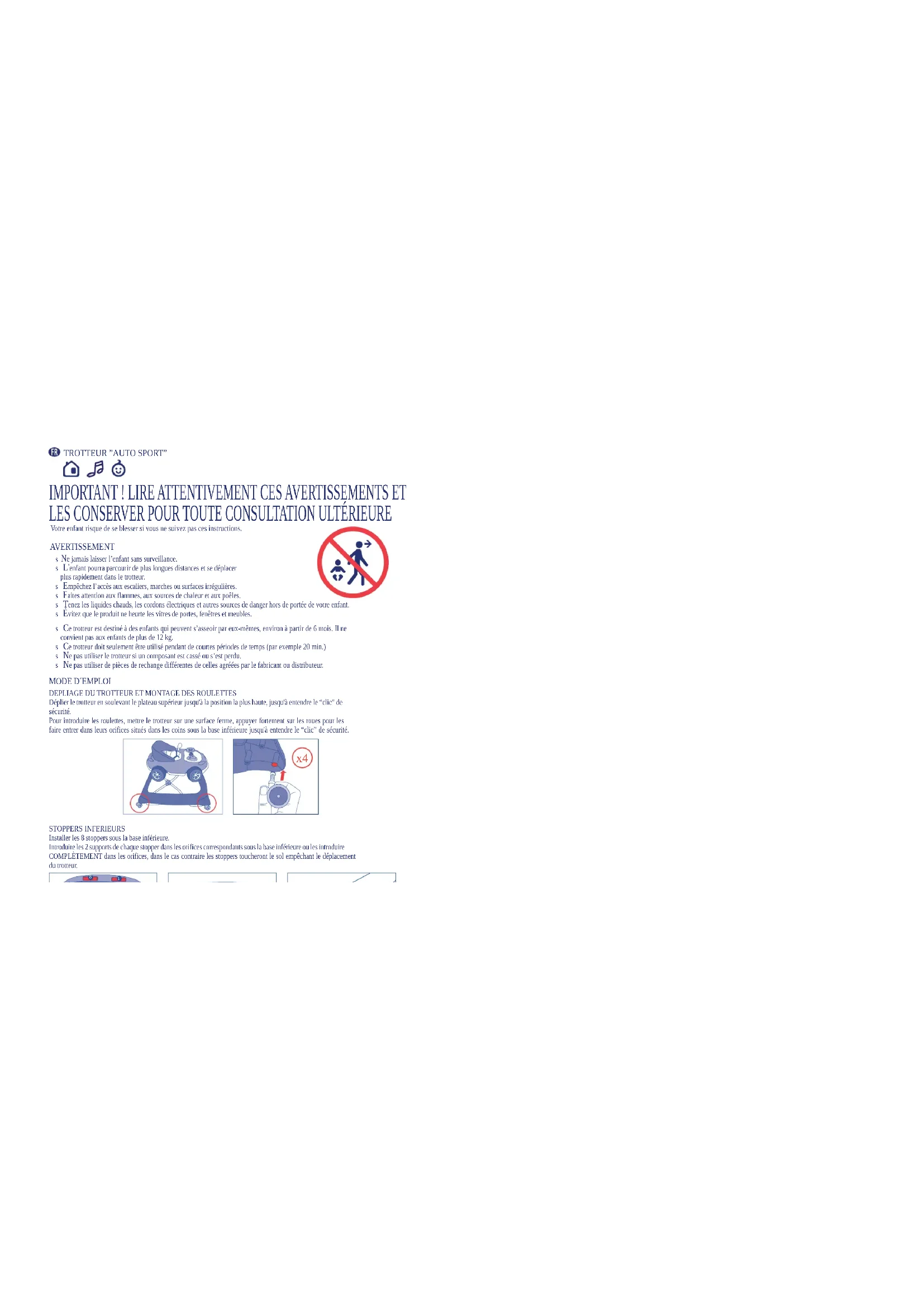 AVERTISSEMENT sCe trotteur est destiné à des enfants qui peuvent s’asseoir par eux-mêmes, environ à partir de 6 mois. Il ne convient pas aux enfants de plus de 12 kg. sCe trotteur doit seulement être utilisé pendant de courtes périodes de temps (par exemple 20 min.) sNe pas utiliser le trotteur si un composant est cassé ou s’est perdu. sNe pas utiliser de pièces de rechange différentes de celles agréées par le fabricant ou distributeur.