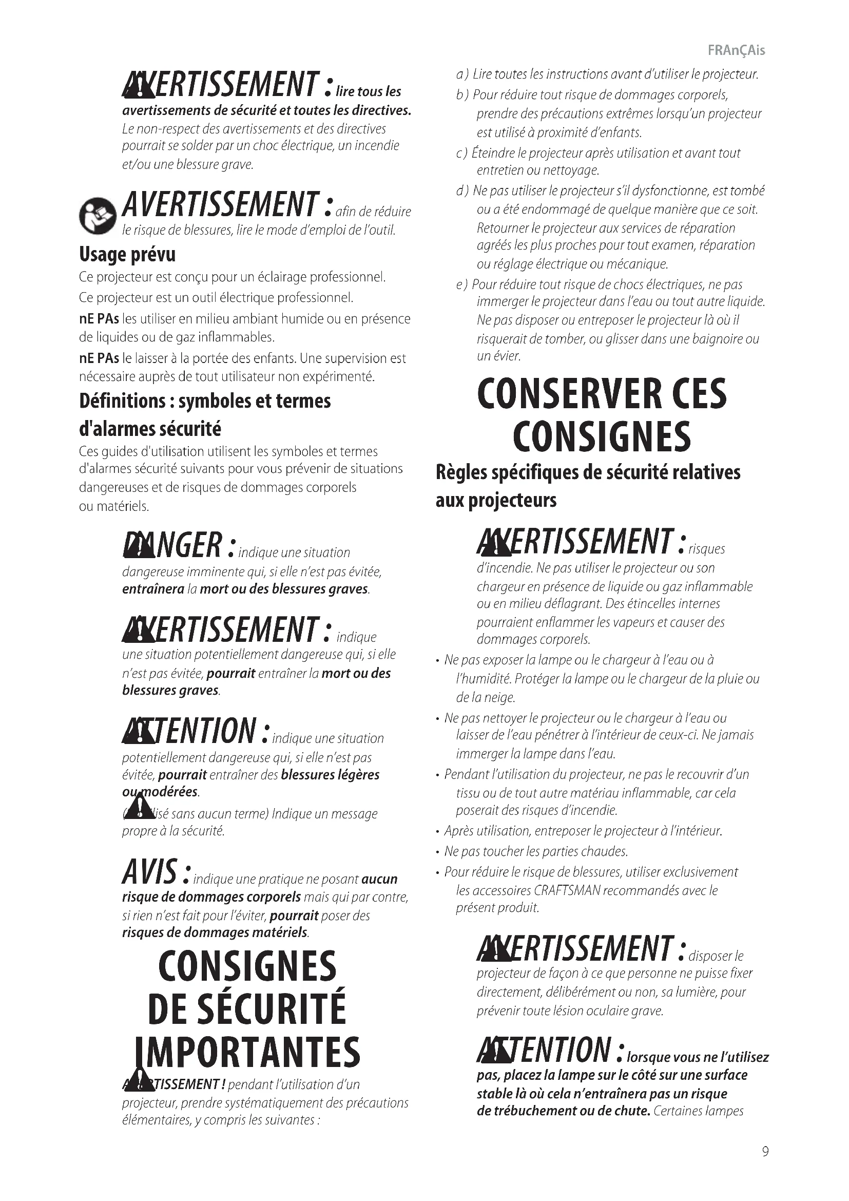 - Ces chargeurs ne sont pas conçus pour toute utilisation autre que le chargement CRAFTSMAN. Les autres types de chargement de blocs-piles peuvent causer la surchauffe et l’éclatement de ceux-ci, entraînant une blessure corporelle, des dommages matériels, un choc électrique ou uneélectrocution.FRANÇAIS