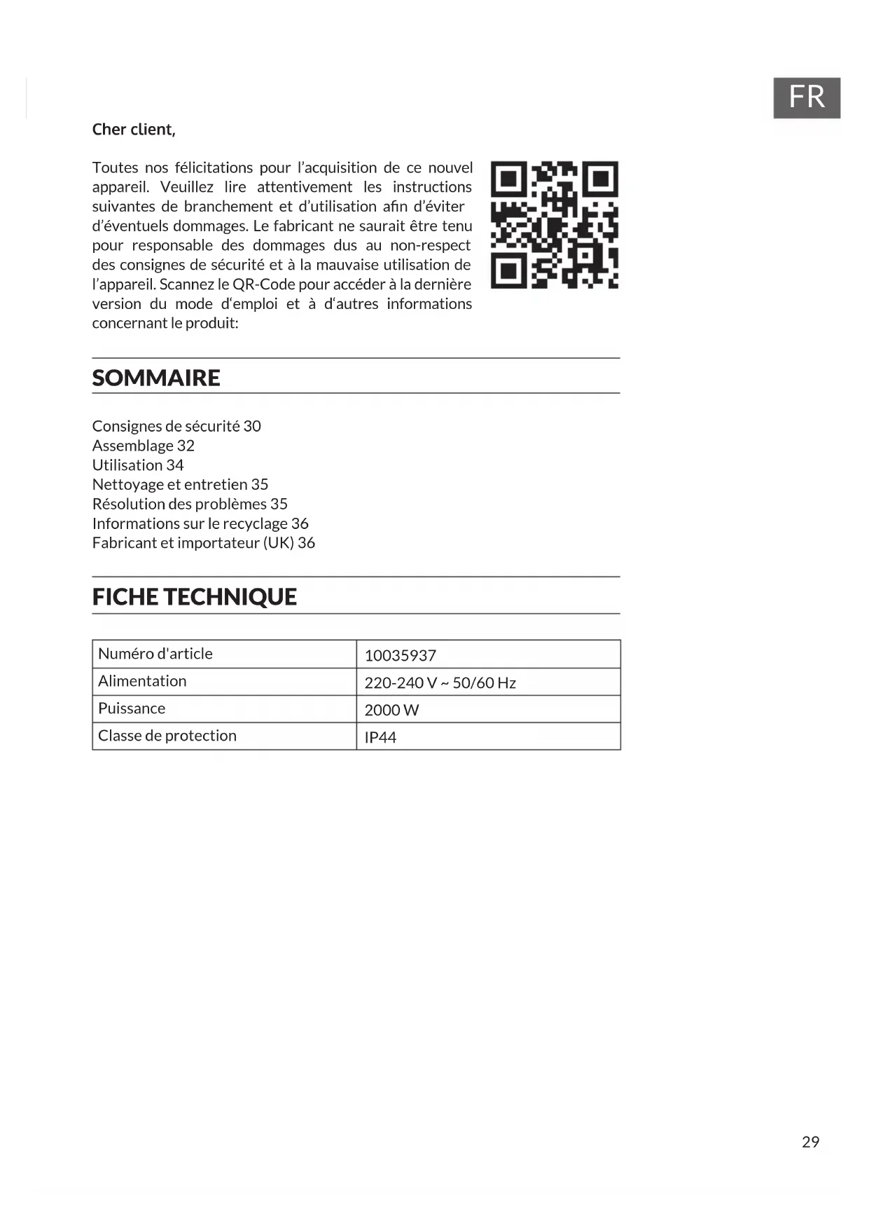 Cher client, Toutes nos félicitations pour l’acquisition de ce nouvel appareil. Veuillez lire attentivement les instructions suivantes de branchement et d’utilisation an d’éviter d’éventuels dommages. Le fabricant ne saurait être tenu pour responsable des dommages dus au non-respect des consignes de sécurité et à la mauvaise utilisation de l’appareil. Scannez le QR-Code pour accéder à la dernière version du mode d‘emploi et à d‘autres informations concernant le produit: SOMMAIRE Consignes de sécurité 30 Assemblage 32 Utilisation 34 Nettoyage et entretien 35 Résolution des problèmes 35 Informations sur le recyclage 36 Fabricant et importateur (UK) 36 FICHE TECHNIQUE Numéro d'article