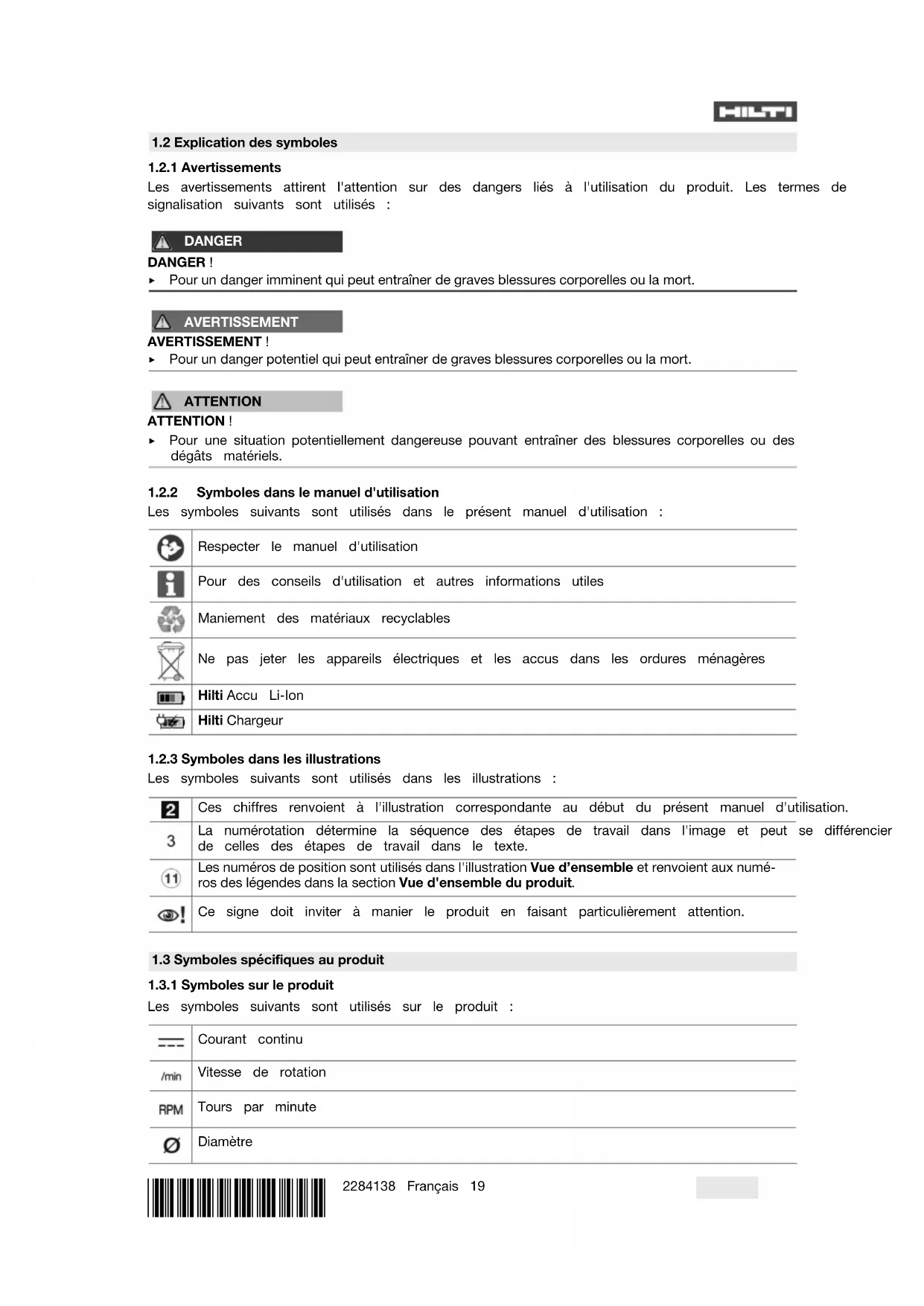 Les symboles suivants sont utilisés dans le présent manuel d'utilisation : Respecter le manuel d'utilisation Pour des conseils d'utilisation et autres informations utiles Maniement des matériaux recyclables Ne pas jeter les appareils électriques et les accus dans les ordures ménagères Hilti Accu Li-Ion Hilti Chargeur