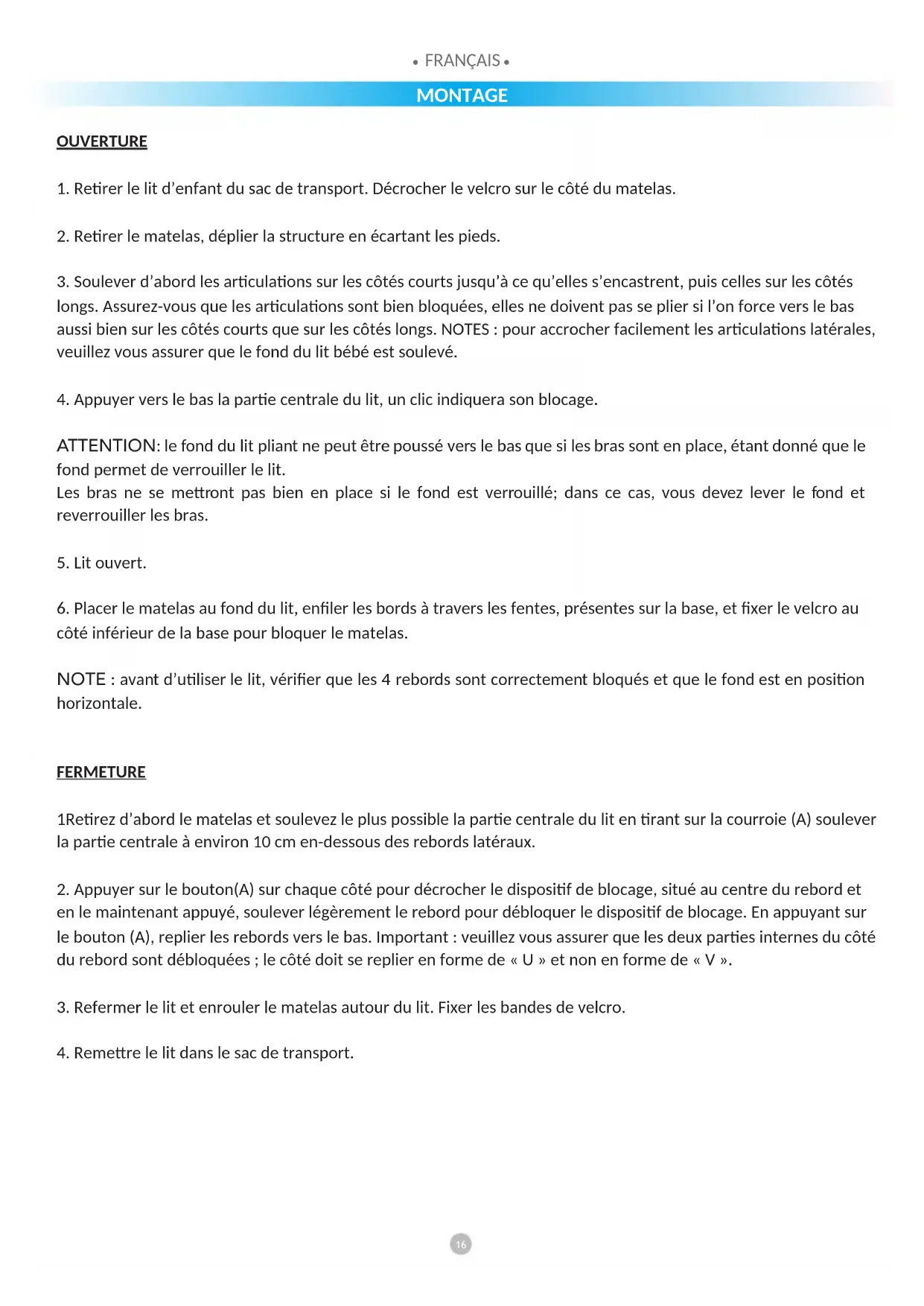 - ATTENTION: ne pas uliser le lit de voyage sans matelas.