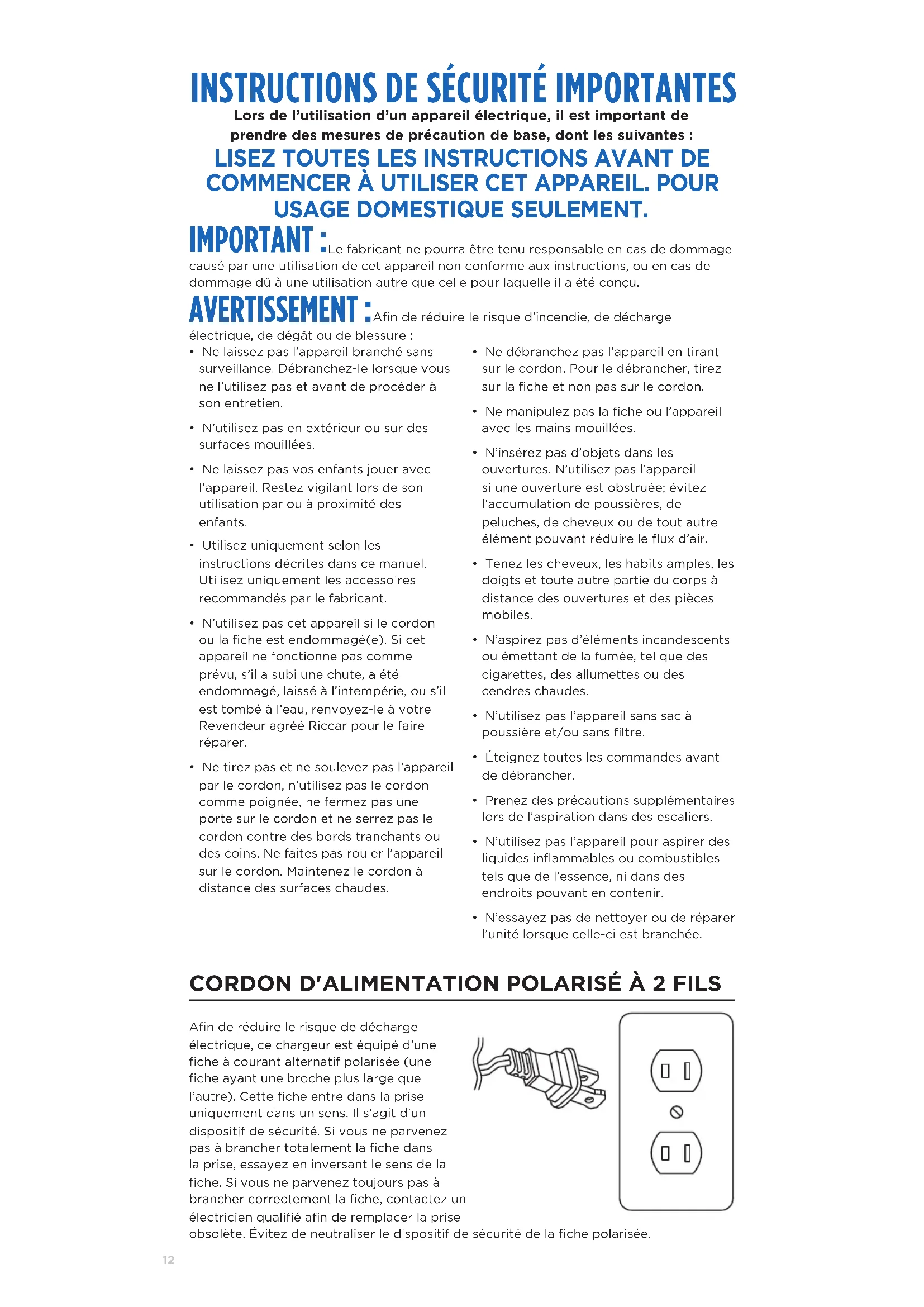 Afin de réduire le risque d’incendie, de décharge électrique, de dégât ou de blessure:• Ne laissez pas l’appareil branché sans surveillance. Débranchez-le lorsque vous ne l’utilisez pas et avant de procéder à son entretien.• N’utilisez pas en extérieur ou sur des surfaces mouillées.• Ne laissez pas vos enfants jouer avec l’appareil. Restez vigilant lors de son utilisation par ou à proximité des enfants.• Utilisez uniquement selon les instructions décrites dans ce manuel. Utilisez uniquement les accessoires recommandés par le fabricant.• N’utilisez pas cet appareil si le cordon ou la fiche est endommagé(e). Si cet appareil ne fonctionne pas comme prévu, s’il a subi une chute, a été endommagé, laissé à l’intempérie, ou s’il est tombé à l’eau, renvoyez-le à votre Revendeur agréé Riccar pour le faire réparer.• Ne tirez pas et ne soulevez pas l’appareil par le cordon, n’utilisez pas le cordon comme poignée, ne fermez pas une porte sur le cordon et ne serrez pas le cordon contre des bords tranchants ou des coins. Ne faites pas rouler l’appareil sur le cordon. Maintenez le cordon à distance des surfaces chaudes.• Ne débranchez pas l’appareil en tirant sur le cordon. Pour le débrancher, tirez sur la fiche et non pas sur le cordon.• Ne manipulez pas la fiche ou l’appareil avec les mains mouillées.• N’insérez pas d’objets dans les ouvertures. N’utilisez pas l’appareil si une ouverture est obstruée; évitez l’accumulation de poussières, de peluches, de cheveux ou de tout autre élément pouvant réduire le flux d’air.• Tenez les cheveux, les habits amples, les doigts et toute autre partie du corps à distance des ouvertures et des pièces mobiles.• N’aspirez pas d’éléments incandescents ou émettant de la fumée, tel que des cigarettes, des allumettes ou des cendres chaudes.• N’utilisez pas l’appareil sans sac à poussière et/ou sans filtre.• Éteignez toutes les commandes avant de débrancher.• Prenez des précautions supplémentaires lors de l’aspiration dans des escaliers.• N’utilisez pas l’appareil pour aspirer des liquides inflammables ou combustibles tels que de l’essence, ni dans des endroits pouvant en contenir.• N’essayez pas de nettoyer ou de réparer l’unité lorsque celle-ci est branchée.13 ASSEMBLÉE